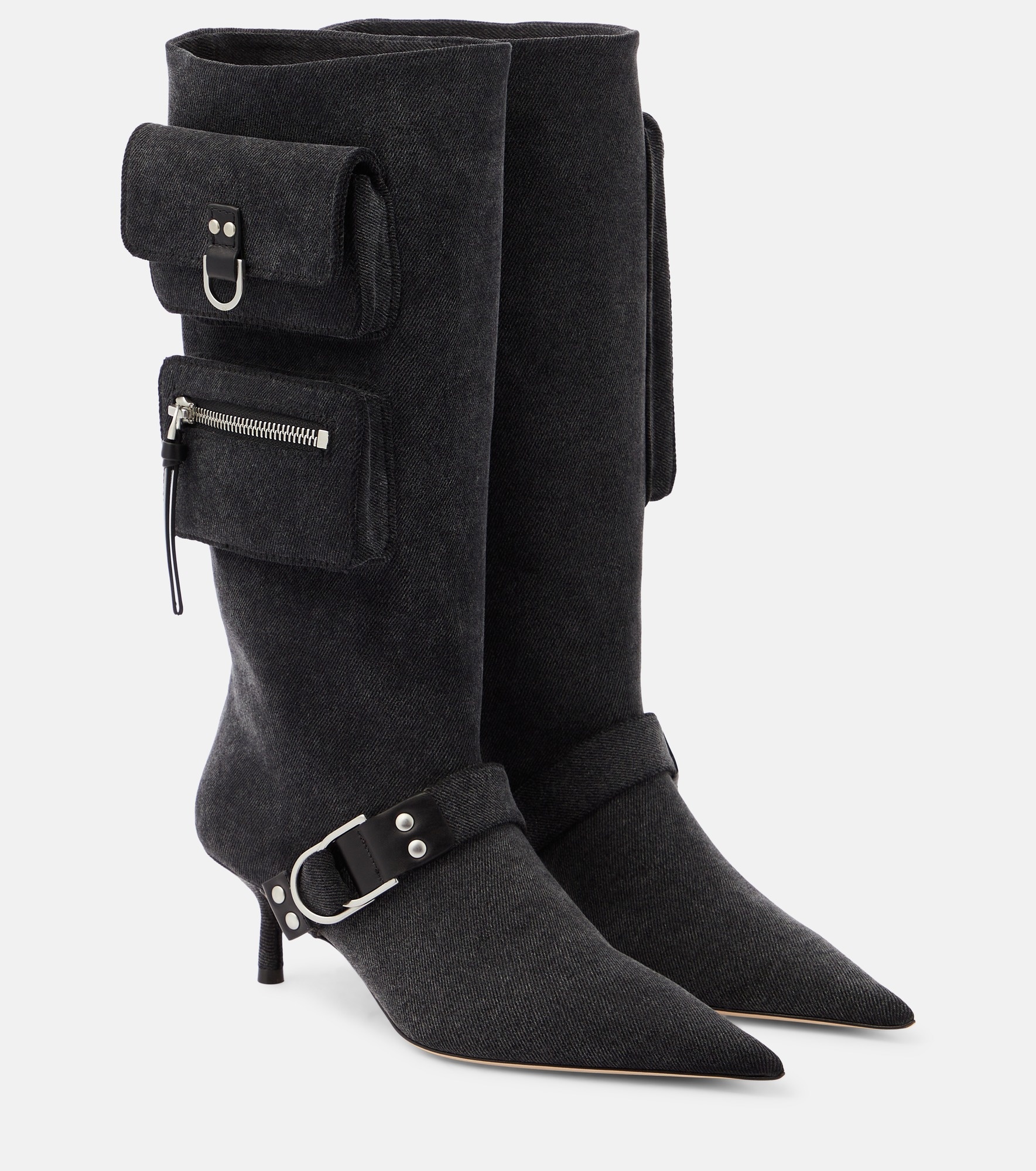 Stride confidently in style with the Jeanne boots from Blumarine. Made from dark blue denim for a nostalgic feel, the knee-high design features pockets along the shafts and buckle fastenings. Product Details - Upper: fabric - Lining: leather - Sole: leather insole and sole - Toe shape: pointed toe - Made in Italy - Includes: shoe box - Designer color name: Dark Blue - Comes with dust bag - Item number: P00835841 Size & Fit - True to size - European sizes - 5,5cm-2" heel (size EU 38) - 32cm-12.5" shaft height (size EU 38) - 38cm-15" shaft width (size EU 38)