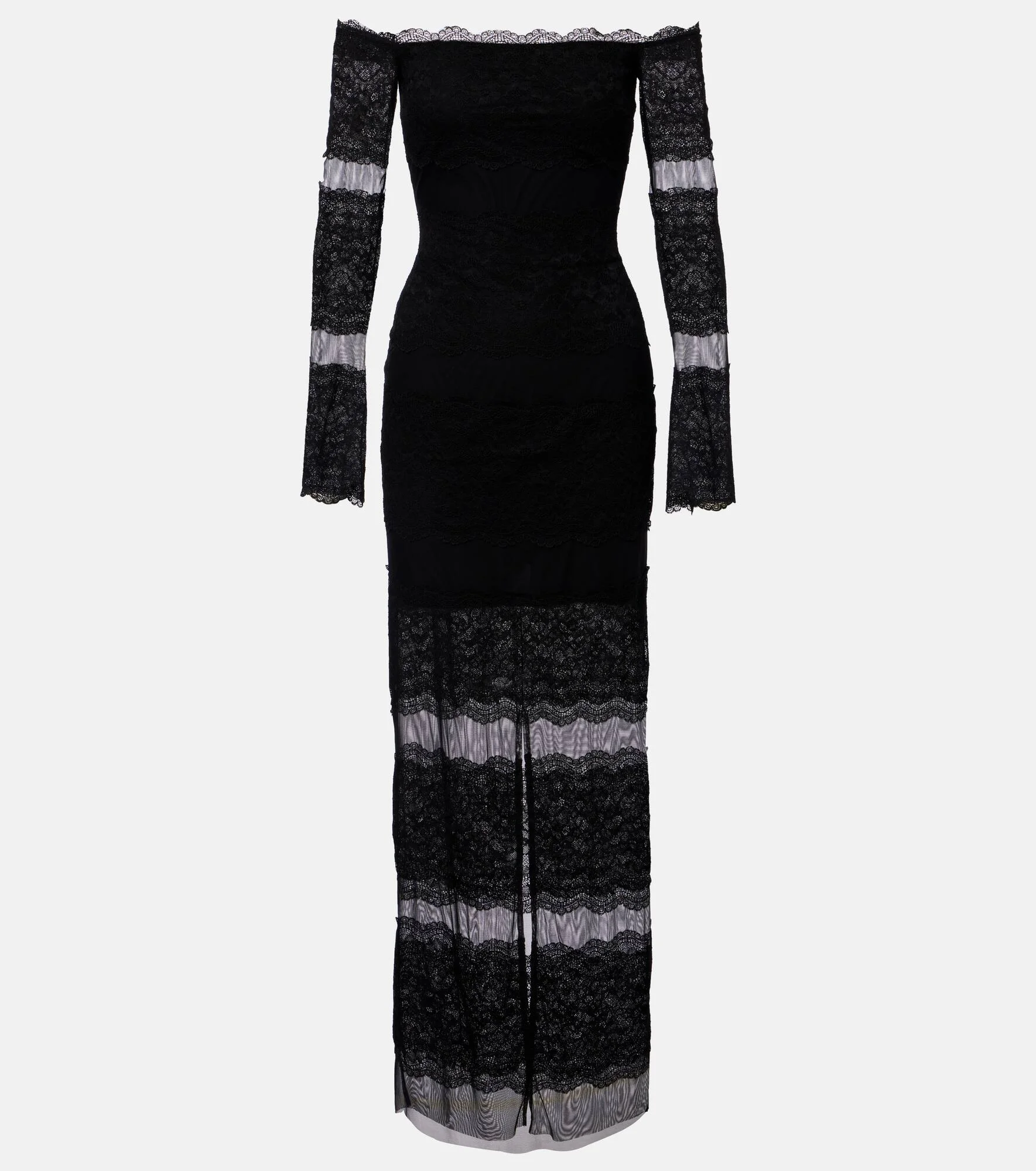 This maxi dress from Blumarine is crafted from lace tulle, featuring an off-shoulder, scalloped neckline and a semi-sheer skirt. With its body-hugging fit, this piece exudes modern charm. Product Details - Material: 82% polyamide, 18% elastane - Care instructions: machine wash at 30 degrees - Made in Italy - Color: black - Designer color name: Black - Lace: 85% polyamide, 15% elastane - Lining: 75% polyamide, 25% elastane - Long vent - Item number: P01137401 Size & Fit - True to size - Off-the-shoulder - Fitted - Stretchy fabric - slit length 50cm-19.5" - The model seen in the picture is 178cm-5'10" and wearing a size IT 40