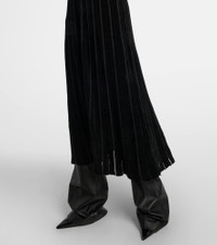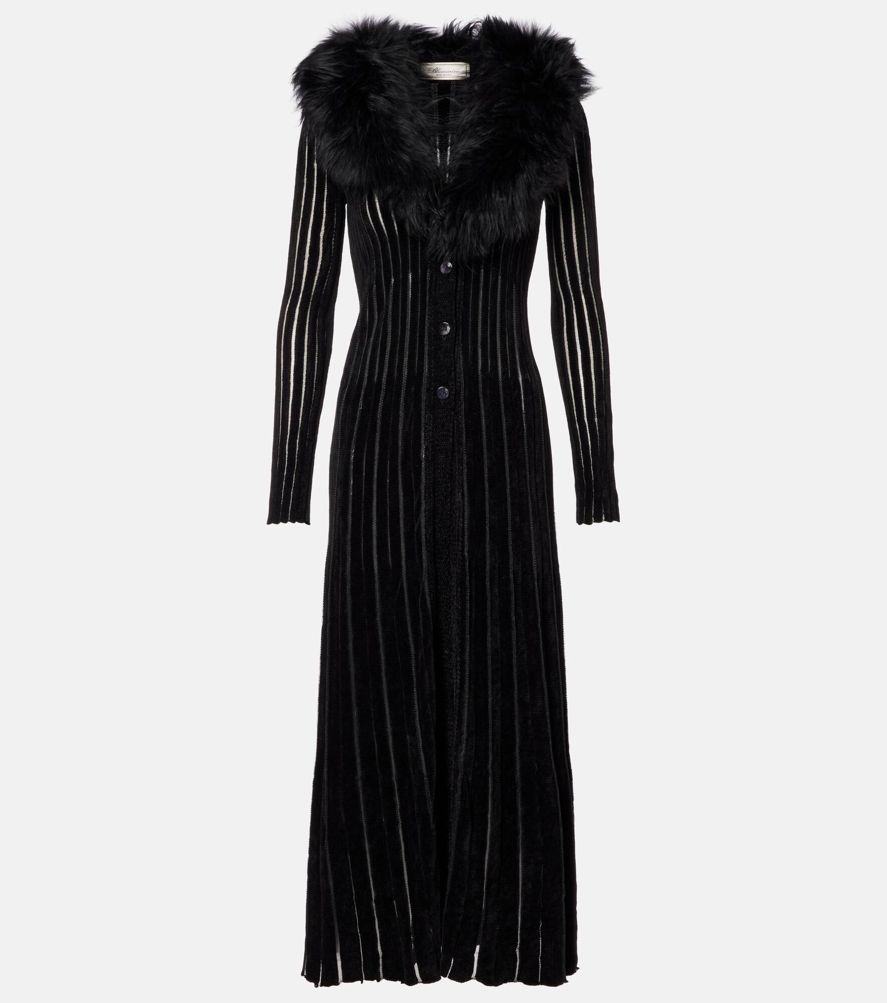 Blumarine captures the opulence of the '00s, contemporizing the Y2K aesthetic for a modern audience. This maxi dress features a striped pattern, and the half-buttoned front is finished with a shearling-trimmed V-neckline. Product Details - Material: 100% viscose - Care instructions: hand wash - Made in Italy - Designer color name: Black - Item color: black - Material II: 100% polyester - Contains non-textile parts of animal origin - Insert: 100% lamb leather - Closure: buttoned front - Detachable collar - Item number: P01067681 Size & Fit - True to size - Semi-sheer - Fitted - Slightly stretchy fabric - The model seen in the picture is 178cm-5'10" and wearing a size XS