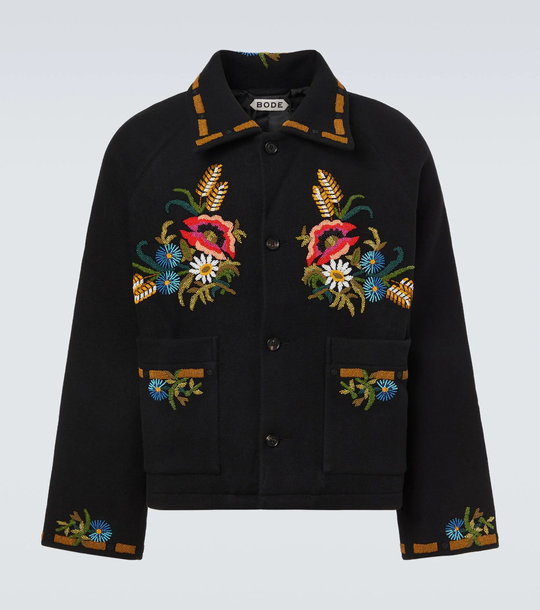 With the sole mission of telling stories through fashion, Bode creates nostalgic styles using historical techniques and vintage patterns. The Beaded Aquitaine jacket is made from felted wool and features floral and geometric embellishments inspired by a folk tablecloth. Product Details - Material: 100% wool - Care instructions: dry clean - Made in India - Designer color name: Black - Item color: black - Lining: 100% viscose - Closure: buttoned front - Pockets: patch pockets, internal pocket - Item number: P01049164 Size & Fit - True to size - Straight fit - Non-stretchy fabric - Falls to the hip - The model in the picture is 185cm-6'1" and wearing a size L
