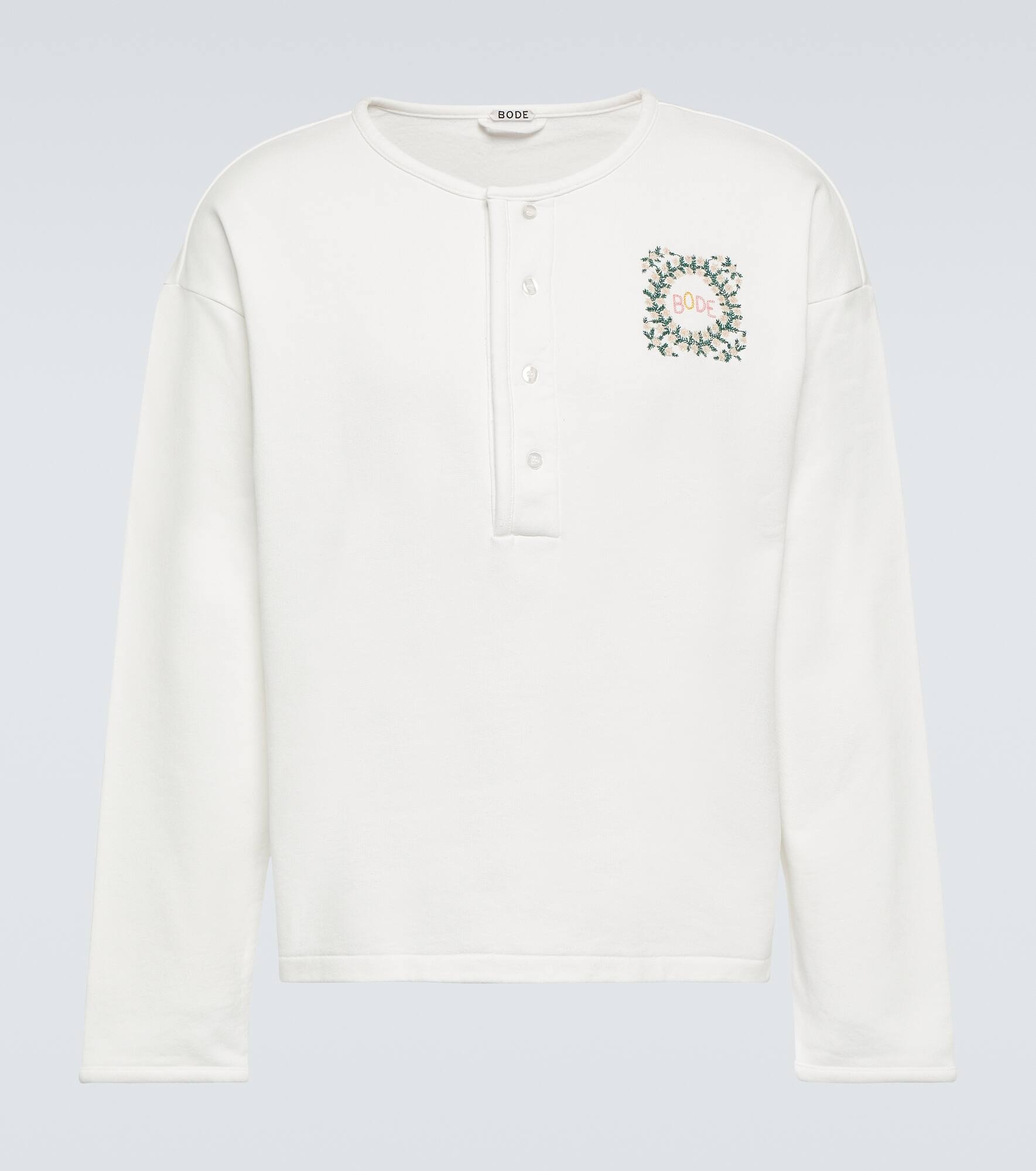 With the sole mission of telling stories through fashion, Bode creates nostalgic styles using historical techniques and vintage patterns. The Daisy Never Tell Henley shirt is crafted from cotton jersey with a flowery logo patch. Product Details - Material: 100% cotton - Care instructions: machine wash cold - Made in Portugal - Designer color name: Cream - Closure: partially buttoned front - Item number: P00837167 Size & Fit - True to size - Dropped shoulders - Oversized - Mid-weight material - Falls to the hip - The model in the picture is 185cm-6'1" and wearing a size M