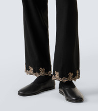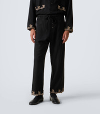 Crafted from wool flannel, the Laurelist pajama pants by Bode feature an embroidered reproduction of vintage passementerie sourced from Paris. The pair features a drawstring waist, side and back pockets, and a button closure. Product Details - Material: 100% wool - Care instructions: dry clean - Made in India - Designer color name: Black - Item color: black - Drawstring waist - Pockets: side slit pockets, back pocket - Closure: button fastening - Item number: P01049135 Size & Fit - Fits large to size - we recommend trying two sizes smaller - Elasticated waist - Adjustable at the waist - Non-stretchy fabric - Wide-leg - Height of model is 188cm-74" and wears a size M