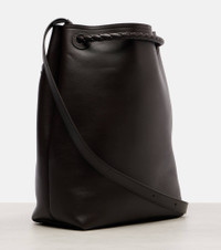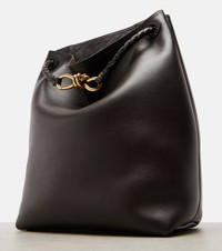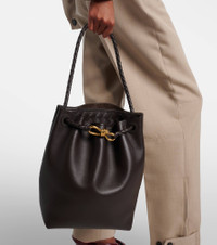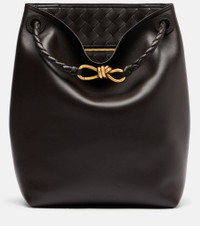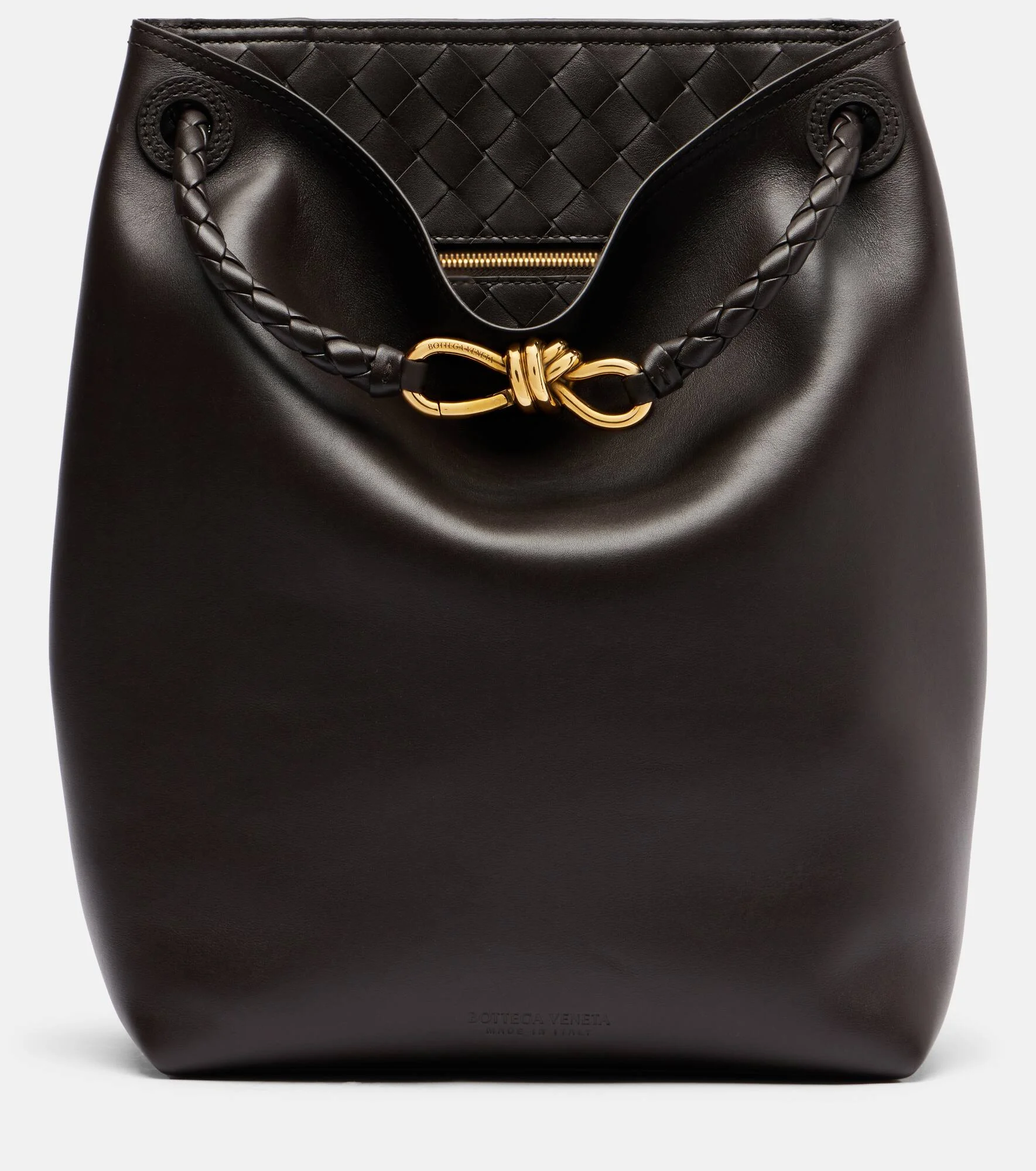 The Andiamo Small bucket bag exemplifies the refined craftsmanship at the heart of Bottega Veneta. Expertly crafted from leather, the piece features braided top handles accented by the house’s signature Knot detail. Product Details - Material: calf leather - Lining: suede - Made in Italy - Designer color name: Fondant-M Brass - Item color: brown - Internal details: internal zipped pocket - Top handles, Detachable, adjustable shoulder strap - Item number: P01097462 Size & Fit - Height 33cm-13" - Width 24cm-9.5" - Depth 12cm-4.5" - Length of handles 40cm-15.5" - Adjustable shoulder strap - Max. length shoulder strap 110cm-43.5"