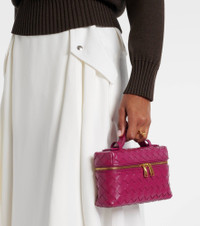 Developed in the 1970s, Bottega Veneta's artful Intrecciato technique guarantees the longevity of its leather goods. Expertly crafted from leather, the Bang Bang Small vanity bag is made using the innovative weave and complete with gold-toned accents. Product Details - Material: leather - Lining: leather - Made in Italy - Designer color name: Cinnabar-Gold - Item color: purple - Hardware color: gold - Internal details: internal slot pocket - Closure: two-way zipped top - Detachable, adjustable shoulder strap, Top handle - Includes: dust bag - Item number: P01054800 Size & Fit - Height 12,5cm-5" - Width 23cm-9" - Depth 6cm-2.5" - Length of handles 13,5cm-5.5" - Adjustable shoulder strap