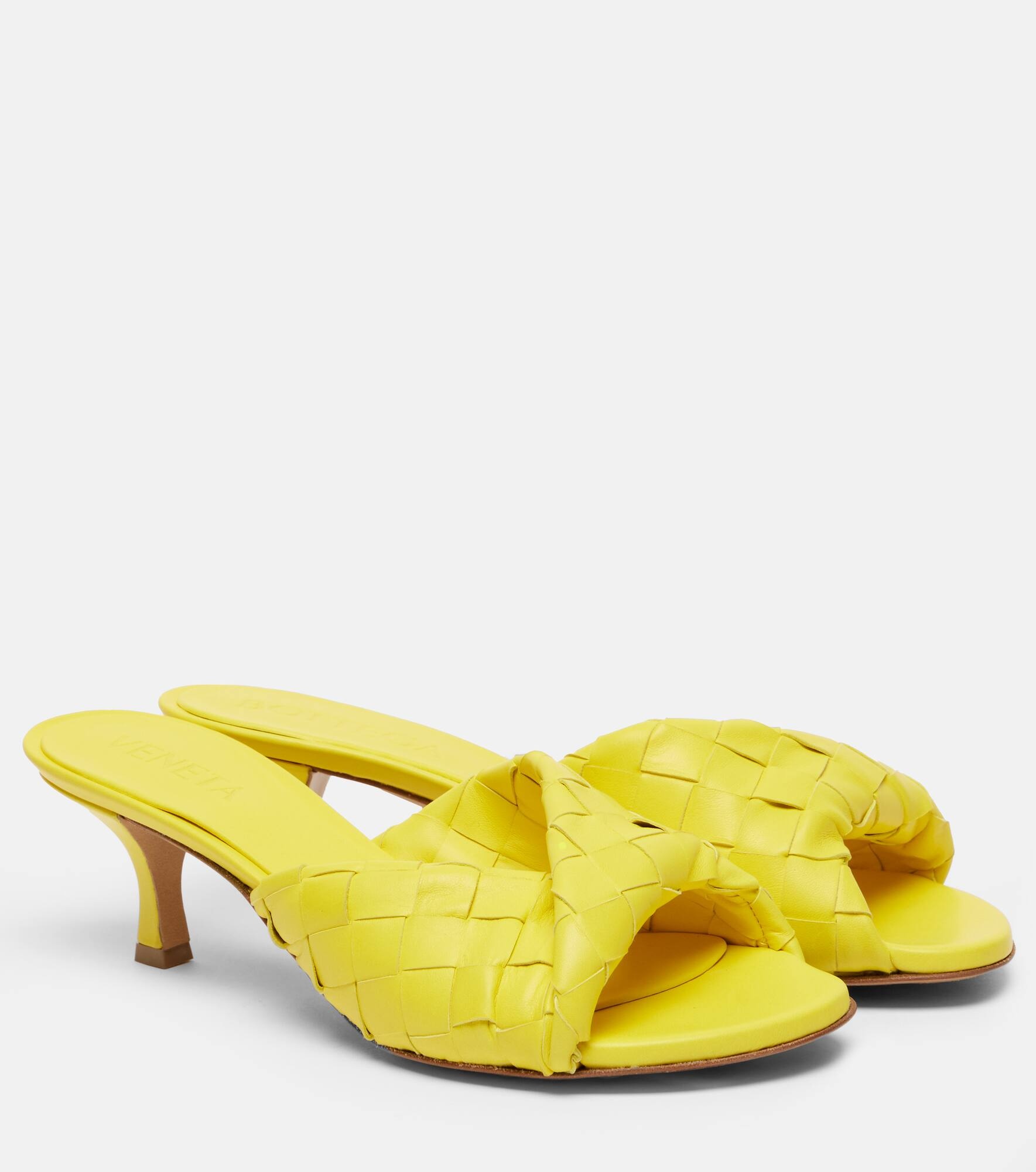 Add a pop of color to your outfit with the Blink mules from Bottega Veneta. The pair was made in Italy from Intrecciato-woven leather, folded into twisted uppers resting on 50mm kitten heels. Product Details - Upper: lamb leather - Lining: leather - Sole: leather insole and sole - Toe shape: almond open toe - Made in Italy - Includes: shoe box, dust bags - Designer color name: Sulfur - Item color: yellow - Item number: P01057335 Size & Fit - True to size - European sizes - 5cm-2" heel (size EU 38)