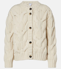 Expertly knitted from a cable-knit wool, this Bottega Veneta cardigan is a timeless addition to any well-curated wardrobe. The piece features a classic button front closure, crewneck, and ribbed details for a sophisticated finish. Product Details - Material: 100% wool - Care instructions: dry clean - Made in Italy - Designer color name: String - Item color: white - Contains non-textile parts of animal origin - Details: 100% wool - Insert: 98% wool, 1% polyamide, 1% elastane - Collar: crewneck - Closure: buttoned front - Cuff: ribbed - Hem: ribbed - Item number: P01099457 Size & Fit - True to size - Dropped shoulders - Straight fit - Slightly stretchy fabric - Falls to the hip - The model seen in the picture is 178cm-5'10" and wearing a size XS