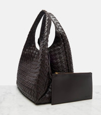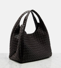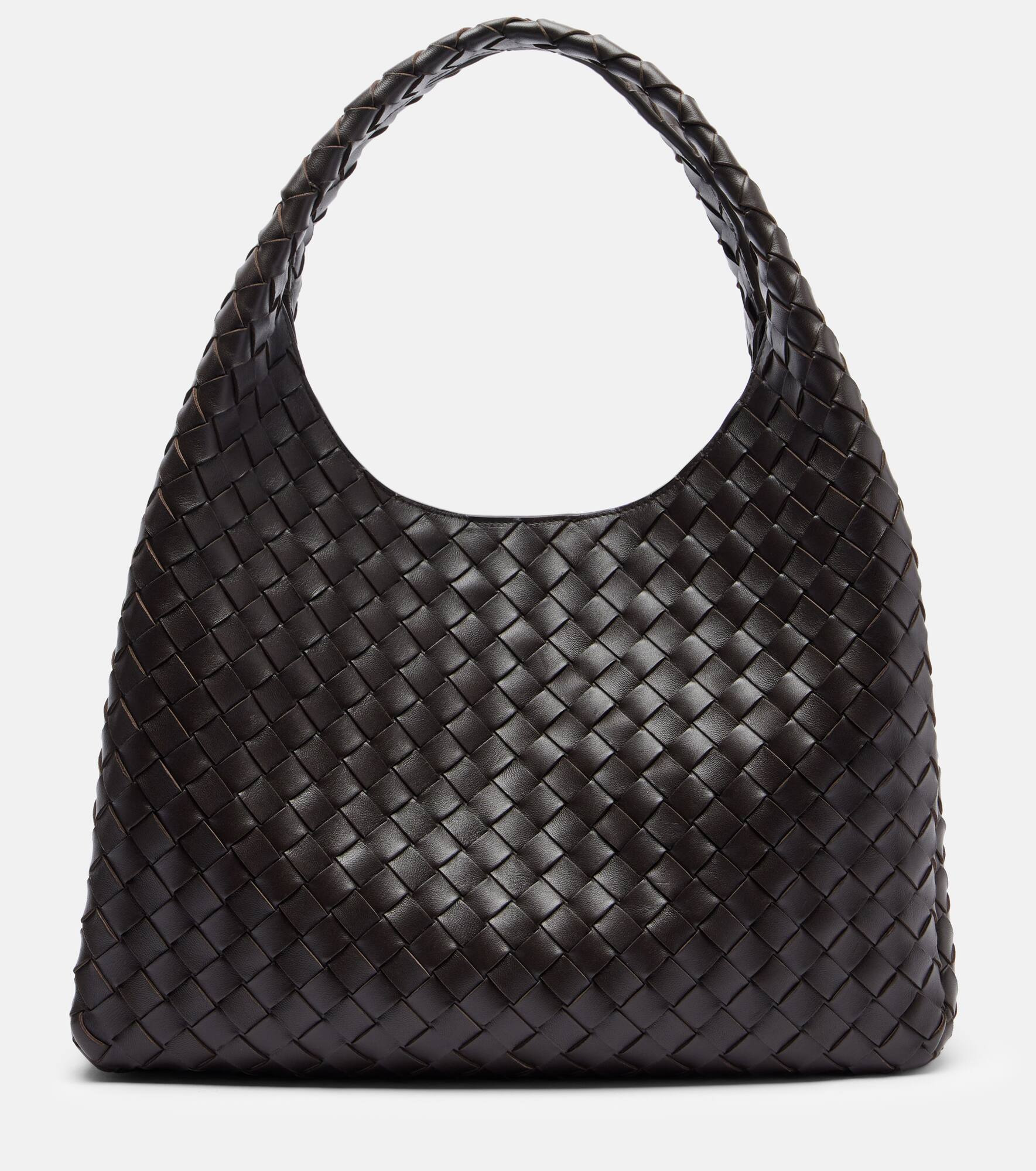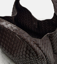 The Campana Large tote bag from Bottega Veneta is crafted using the brand's Intrecciato technique, which guarantees the longevity of its leather goods. This piece features two rigid top handles and a leather tie closure with a hidden magnet. Product Details - Material: lamb leather - Lining: unlined - Made in Italy - Designer color name: Fondant-M Brass - Item color: brown - Top handles - Closure: magnetic fastening, self-tie closure - Internal details: single compartment, internal zipped pocket - Item number: P01097471 Size & Fit - Height 27cm-10.5" - Width 38cm-15" - Depth 17cm-6.5" - Length of handles 35cm-14" - Clutch height 13cm-5" - Clutch width 22.5cm-9"