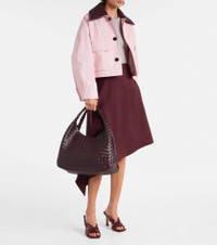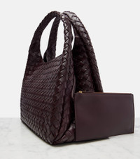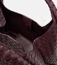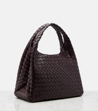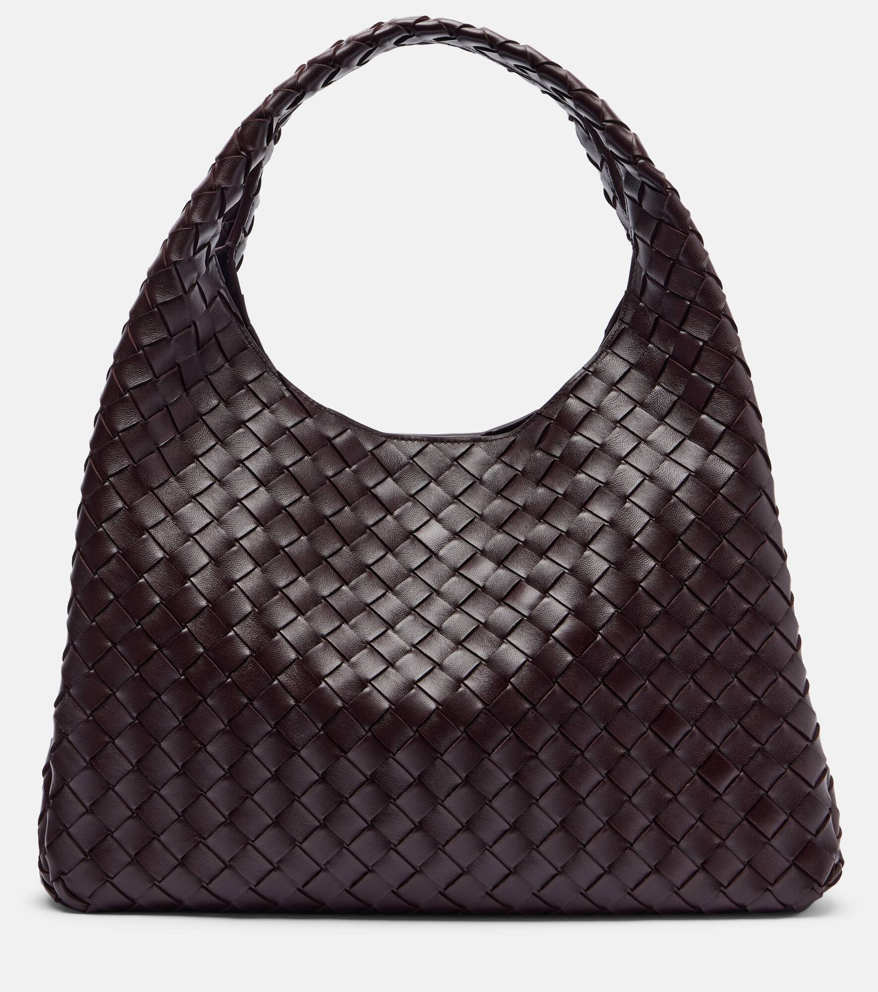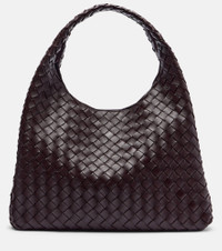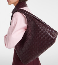 The Campana Large shoulder bag from Bottega Veneta is crafted using the brand's Intrecciato technique, which guarantees the longevity of its leather goods. The style features two rigid top handles and a leather tie closure with a hidden magnet. Product Details - Material: lamb leather - Lining: unlined - Made in Italy - Designer color name: Dark Barolo-M Brass - Item color: burgundy - Top handles - Closure: magnetic fastening, self-tie closure - Internal details: single compartment, internal zipped pocket - Item number: P01097469 Size & Fit - Height 27cm-10.5" - Width 38cm-15" - Depth 17cm-6.5" - Length of handles 35cm-14" - Clutch height 13cm-5" - Clutch width 22.5cm-9"