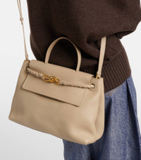 Product Details - Material: leather - Lining: leather - Made in Italy - Designer color name: Ecru-Muse Brass - Internal details: internal zipped pocket, two internal compartments - Closure: latch back fastening - Top handles, Wrist strap, Detachable shoulder strap - Hardware color: gold - Includes: dust bag - Item number: P01031223 Size & Fit - Height 24cm-9.5" - Width 34cm-13.5" - Max. depth 14,5cm-5.5" - Length of handles 42cm-16.5" - Length of handle 29cm-11.5" - Min. length shoulder strap 95cm-37.5" - Max. length shoulder strap 114cm-45"