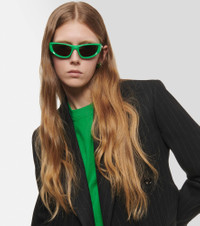 Finish your looks with an ultra-modern touch with the Cone Wraparound sunglasses from Bottega Veneta. The green style has rubber-coated arm tips and metal detailing at the temples. Product Details - Frame color: green - Frame material: acetate - Lens color: black - comes in a case - comes with cleaning cloth - Lens filter category 3 - Made in Japan - Item number: P00750058 Size & Fit - Lens width: 58mm-2.3" - Bridge size: 19mm-0.75" - Earpiece length: 125mm-4.9"