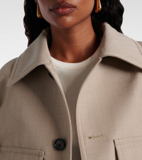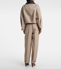 This Bottega Veneta cropped jacket delicately balances a classic silhouette with modern detailing. Made in Italy from pure wool, the garment features a detachable leather collar showcasing the signature Intrecciato technique. Product Details - Material: 100% wool - Care instructions: dry clean - Made in Italy - Designer color name: Beige Melange - Item color: beige - Lining: 100% cotton - Pocket lining: 100% cotton - Detachable collar - Details: 100% lamb leather - Lining II: 100% cotton - Contains non-textile parts of animal origin - Closure: buttoned front - Pockets: flap pockets, side slit pockets - Cuff: buttoned - Includes: garment bag - Item number: P01099445 Size & Fit - True to size - Dropped shoulders - Designed for a loose fit - Non-stretchy fabric - Slightly cropped - The model seen in the picture is 178cm-5'10" and wearing a size IT 40