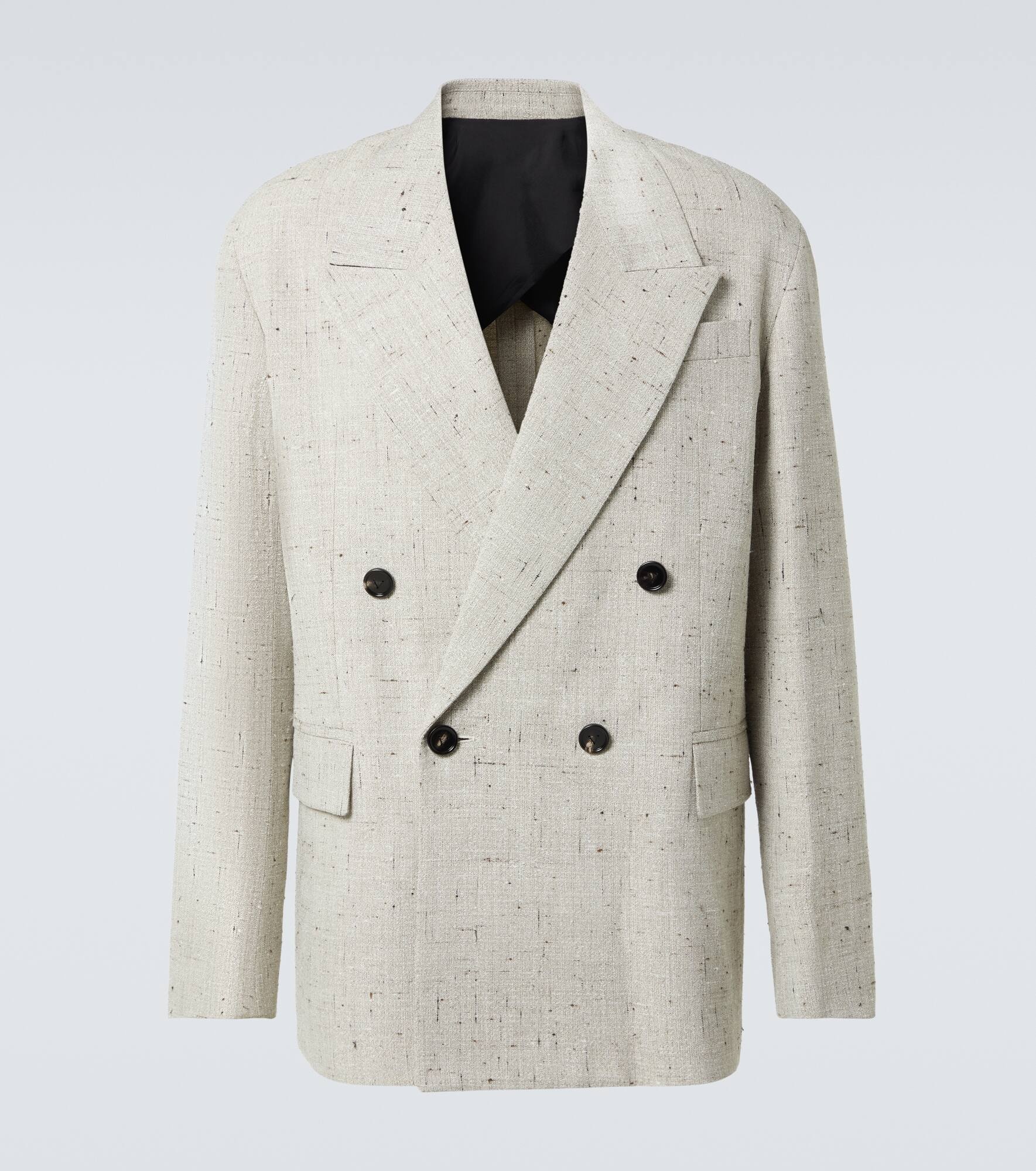 Product Details - Material: 26% silk, 25% cotton, 25% polyester, 24% viscose - Care instructions: dry clean - Made in Italy - Designer color name: Chalk/Algae Melange - Closure: double-breasted buttoned front - Pockets: flap pockets, internal pockets - Lining: 99.8% viscose - Contains non-textile parts of animal origin - Item number: P00998766 Size & Fit - True to size - Straight fit - Non-stretchy fabric - Falls below the hip - The model in the picture is 185cm-6'1" and wearing a size IT 50