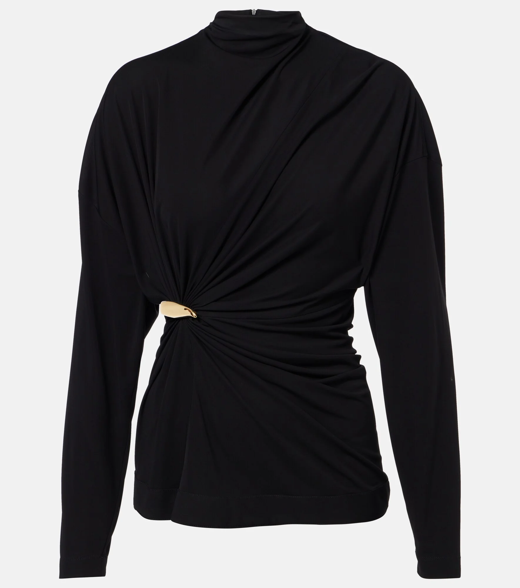 Bottega Veneta has inspired individuality and new modes of craftsmanship since 1966. This top features a unique draped silhouette centered around a contrast hardware detail. Product Details - Material: 100% viscose - Care instructions: dry clean - Made in Italy - Color: black - Designer color name: Ivory Glow - Hardware color: gold - Closure: concealed zipped back - Item number: P01151726 Size & Fit - True to size - Dropped shoulders - Fitted - Slightly stretchy fabric - Falls below the hip - The model seen in the picture is 178cm-5'10" and wearing a size IT 40