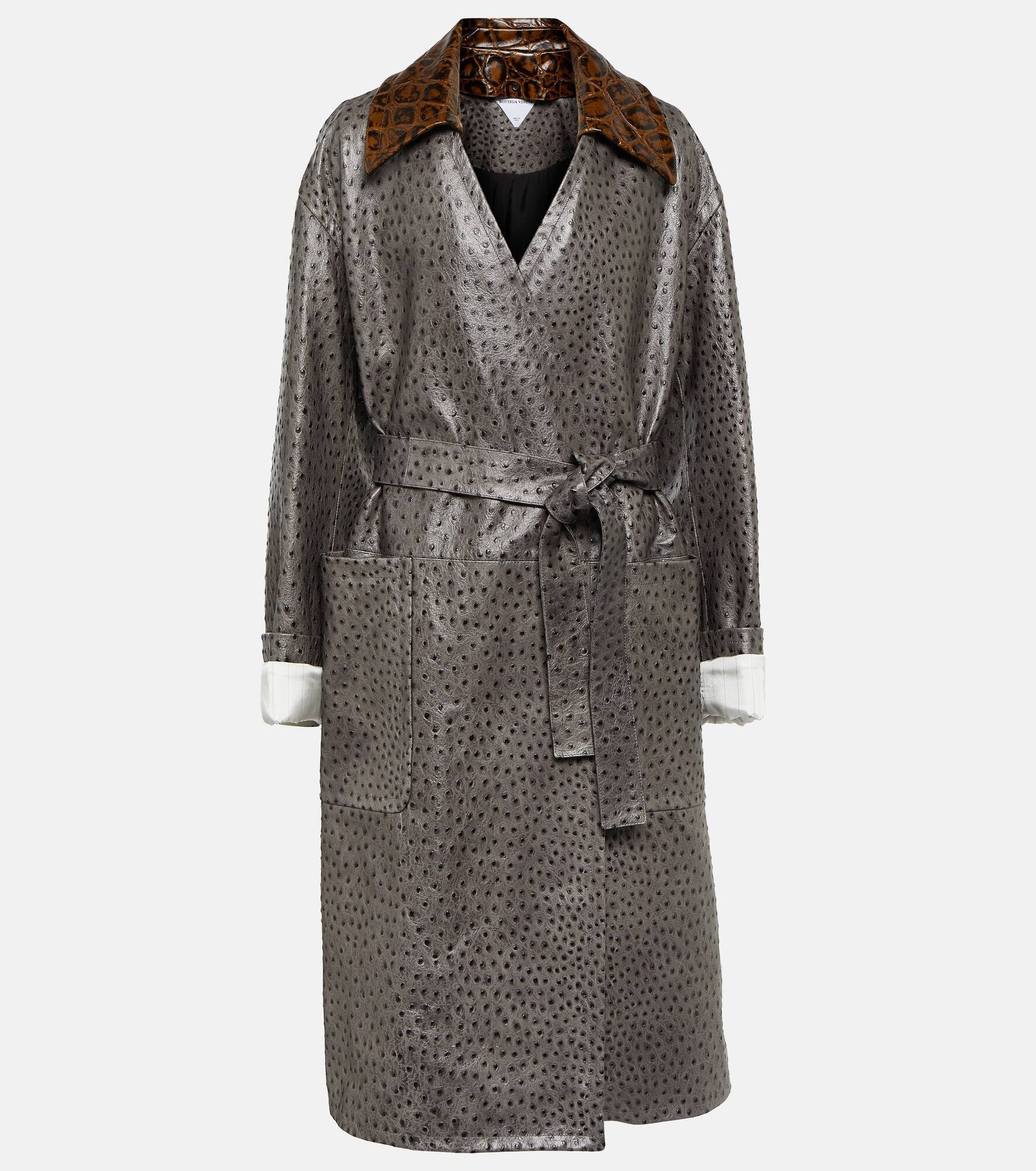 This coat from Bottega Veneta is crafted from ostrich-embossed lambskin and accented with a contrasting collar for a striking combination of textures and hues. Shaped into a relaxed silhouette that's both classic and modern, it comes with a matching belt for cinching the waist. Product Details - Material: 100% lamb leather - Belt loops - Self-tie belt - Comes with garment bag - Care instructions: specialist clean - Made in Italy - Designer color name: Pebble - Material II: 100% leather - Lining: 100% viscose - Sleeve lining: 100% viscose - Pocket lining: 100% cotton - Filling: 100% polyester - Pockets: patch pockets, internal pocket - Item number: P00850849 Size & Fit - Fits large to size - we recommend trying one size smaller - Designed for an extremely oversized fit - Dropped shoulders - Loose fit, comes with belt - Heavy material - Stiff material - The model seen in the picture is 178cm-5'10" and wearing a size IT 38
