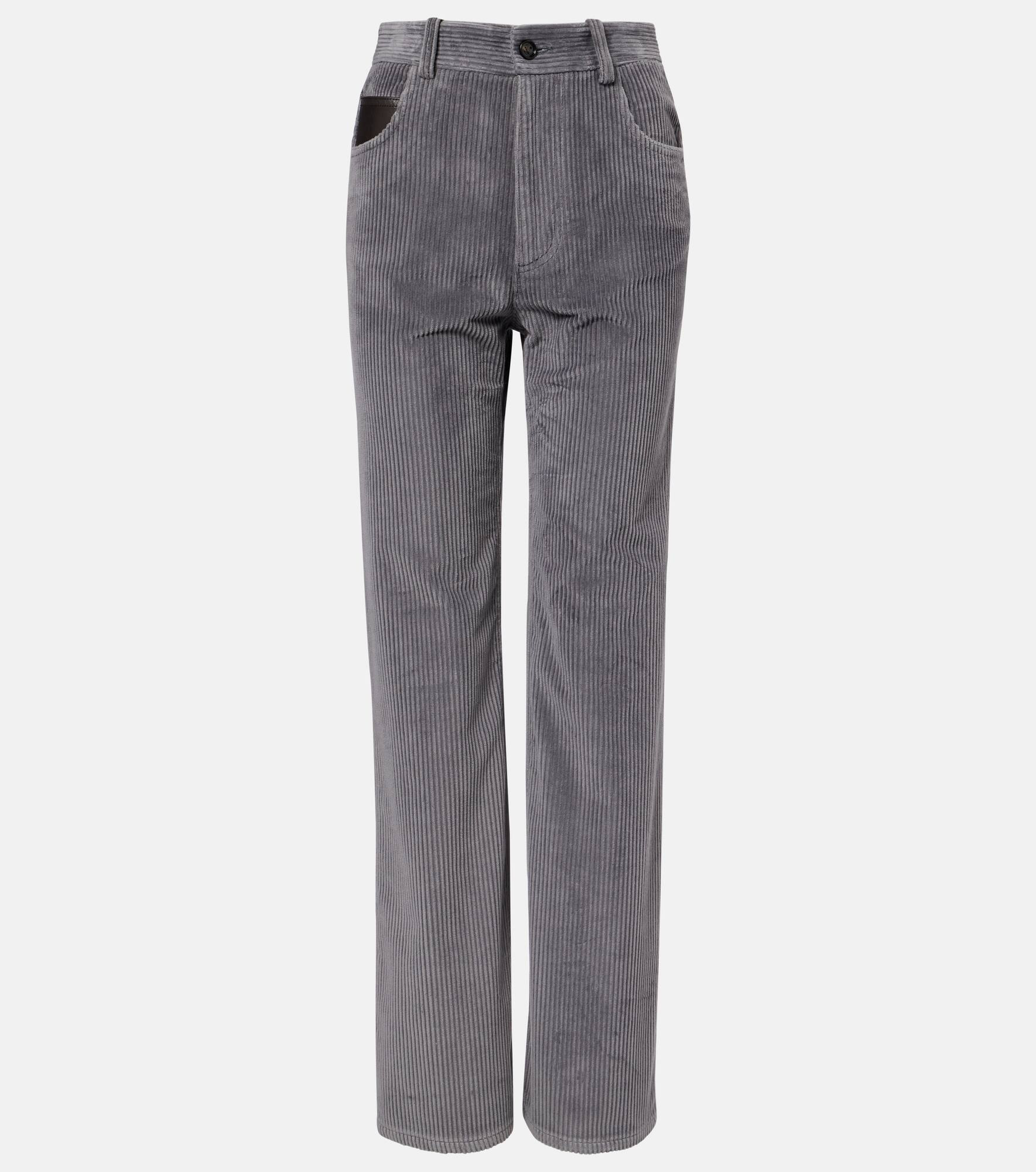 These straight pants from Bottega Veneta are made in Italy from pure cotton corduroy. Featuring subtle leather details, the style is made to a high-rise silhouette. Product Details - Material: 100% cotton - Care instructions: dry clean - Made in Italy - Designer color name: Thunder - Item color: gray - Details: 100% cow leather - Lining: 100% cotton - Pockets: five pockets - Belt loops - Closure: zip and button fastening - Contains non-textile parts of animal origin - Item number: P01099459 Size & Fit - True to size - Non-stretchy fabric - Straight leg - High-waisted - The model seen in the picture is 178cm-5'10" and wearing a size IT 40