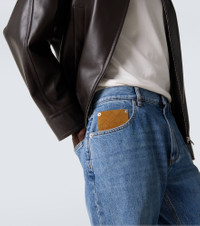 These Bottega Veneta jeans are cut to a wide-leg silhouette and designed with a high-rise waistline. The style is finished with folded ankle cuffs and a suede leather patch showcasing the signature Intrecciato technique. Product Details - Material: 100% cotton - Care instructions: machine wash at 30 degrees - Made in Italy - Designer color name: Mid Blue - Item color: blue - Details: 100% cow leather (suede) - Pocket lining: 65% polyester, 35% cotton - Contains non-textile parts of animal origin - Closure: zipper fly, button fastening - Pockets: five pockets - Belt loops - Dye: medium - Item number: P01076345 Size & Fit - True to size - Non-stretchy fabric - Straight leg - Mid-rise - Height of model is 192cm-75.5" and wears a size 50