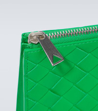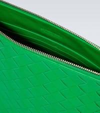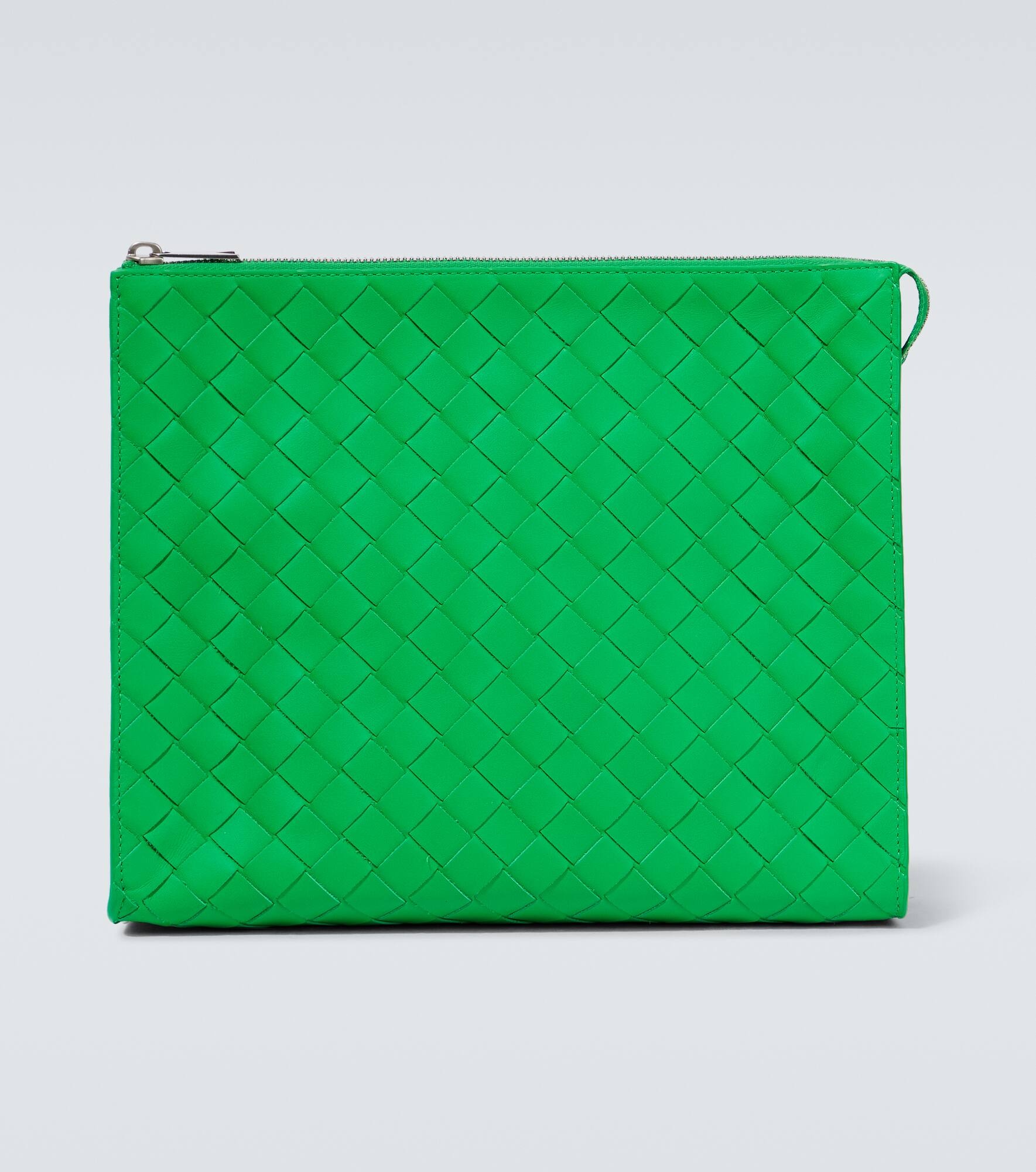 Made from leather in an Intrecciato weave, this parakeet green document case from Bottega Veneta has a zipped top and is fully lined with leather. Product Details - Closure: zipped top - Made in Italy - Designer color name: Parakeet-Silver - Internal details: internal slot pockets, leather lining, Card slots - Color of fastening: silver - Material: calf leather - Item number: P00745794 Size & Fit - Height 22cm-8.5" - Width 27cm-10.5" - Max. depth 8cm-3"
