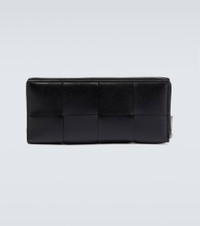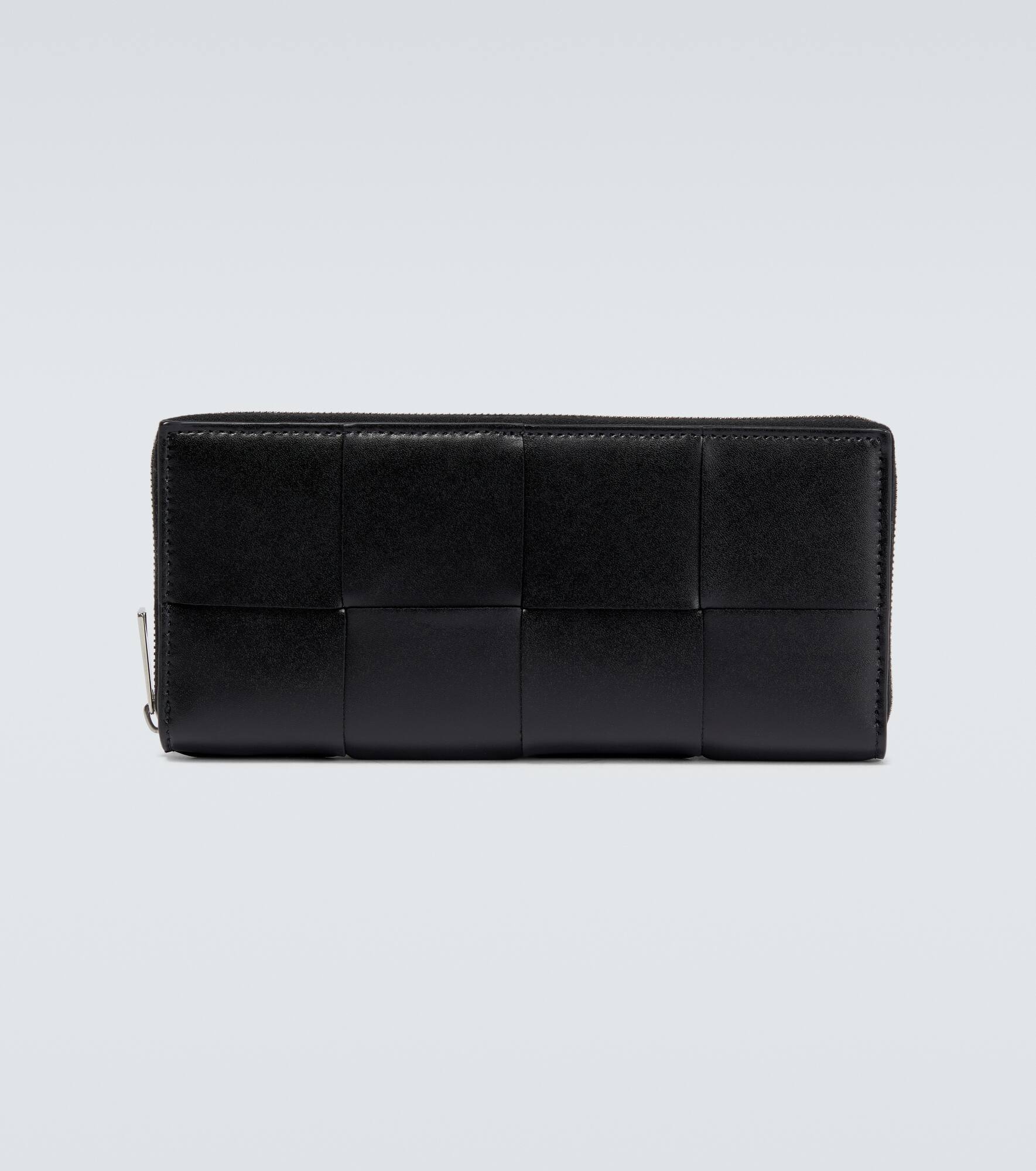In 1 brand-signature style, this Bottega Veneta wallet is made from smooth leather in an Intreccio weave. This piece has a zip-around top, nine slots for cards, two for notes, and a snap-buttoned coin pocket. Product Details - Closure: zipped top - Color of fastening: silver - Internal details: Card slots, bill slots, leather lining, snap-buttoned coin pocket - Material: leather - Comes with dust bag - Comes with a box - Made in Italy - Item number: P00688524 Size & Fit - Height 10cm-4" - Width 20cm-8" - Depth 2cm-1"