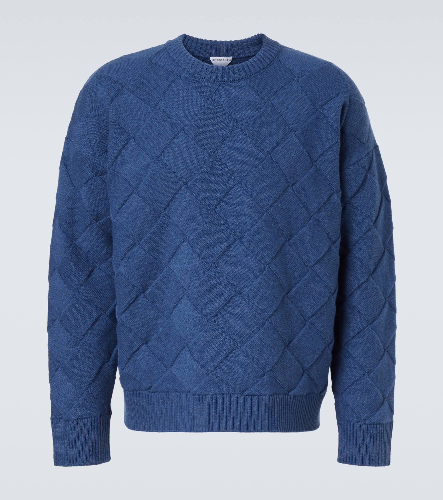 Crafted from a soft wool blend, this Bottega Veneta sweater is designed with fabric strips woven into a grid pattern: a textile interpretation of the Intreccio leather technique. This piece comes with a classic crewneck and a relaxed silhouette. Product Details - Material: 96% wool, 3% polyamide, 1% elastane - Care instructions: dry clean - Made in Italy - Designer color name: Cruise - Item color: blue - Trim: 95% wool, 4% polyamide, 1% elastane - Collar: crewneck - Hem: ribbed - Item number: P01076342 Size & Fit - True to size - Dropped shoulders - Designed for a loose fit - Stretchy fabric - Falls to the hip - Height of model is 188cm-74" and wears a size L