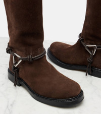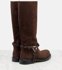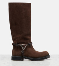 Bottega Veneta has inspired individuality and new modes of craftsmanship since 1966. Made in Italy from brown suede, the James knee-high boots are characterized by braided straps with Knot details and silver-toned triangular accents. Product Details - Upper: calf leather (suede) - Lining: leather - Sole: leather insole, rubber sole - Toe shape: round toe - Made in Italy - Includes: shoe box - Designer color name: Fondant - Item color: brown - Hardware color: silver - Item number: P01126438