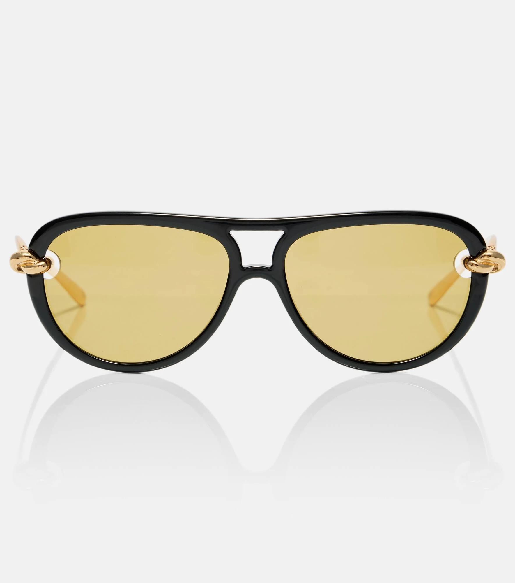 Synonymous with Bottega Veneta since the ‘90s, knotted details have become inextricably linked to the house identity. These aviator sunglasses feature metal temples with the iconic motif at the hinges. Product Details - Frame material: acetate, metal - Frame color: black, gold - Lens filter category 2 - Lens color: yellow - Made in Japan - Includes: case, cleaning cloth - The color of the case may vary - Item number: P01100222 Size & Fit - Lens width: 55mm-2.15" - Bridge size: 10mm-0.4" - Earpiece length: 145mm-5.7"