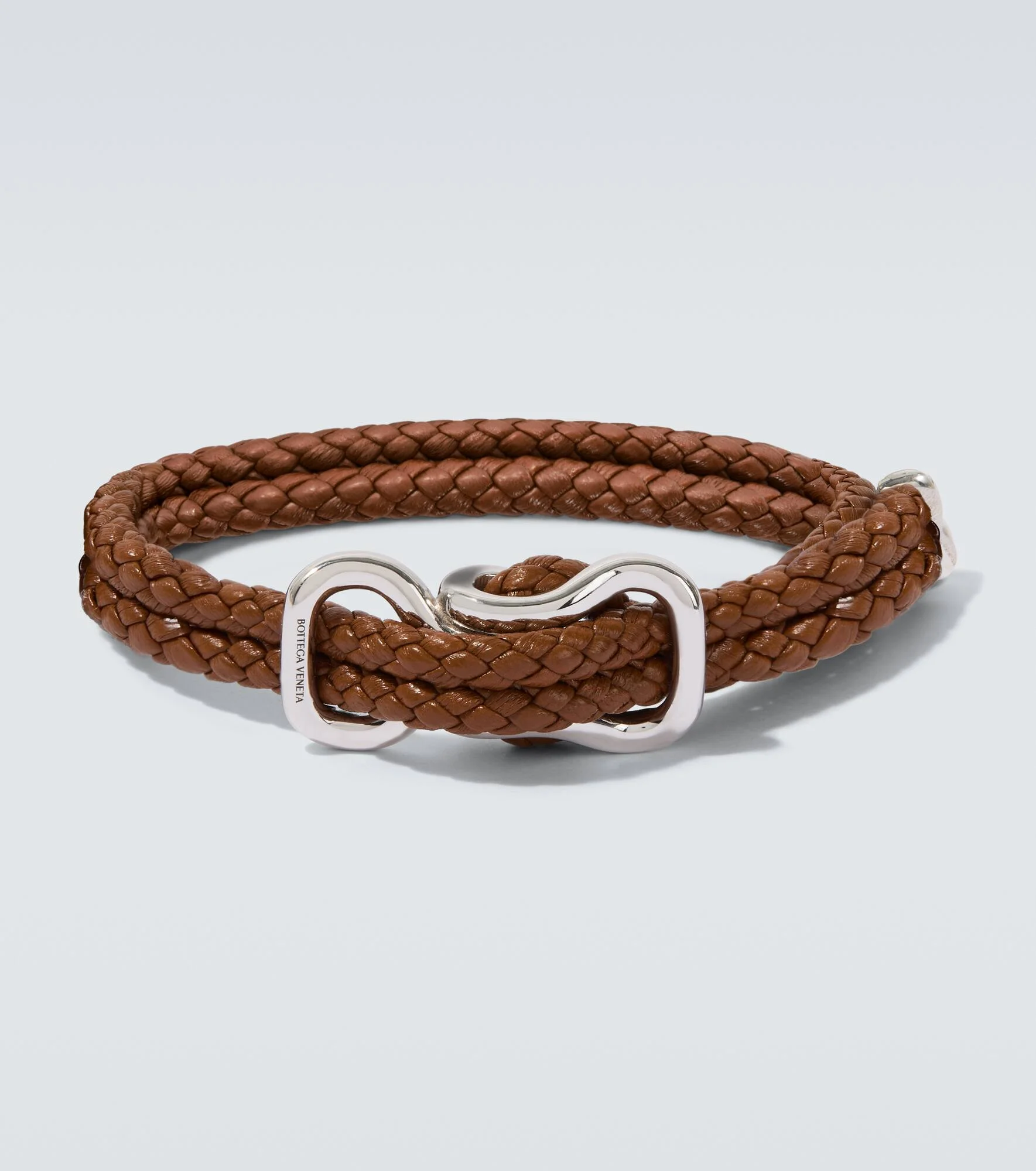 Elevate your looks with edgy accessories from Bottega Veneta. Made in Italy from leather and sterling silver, this double-corded bracelet pays homage to the brand's signature Intrecciato technique with its braided construction. Product Details - Material: leather (nappa), sterling silver - Made in Italy - Includes: dust bag, box - Color: brown - Item number: P01123913 Size & Fit - Min. width 0,7cm-0.5" - Max. width 1,5cm-0.5" - Length of size M = 25,5cm-10" - Length of size L = 27cm-10.5"