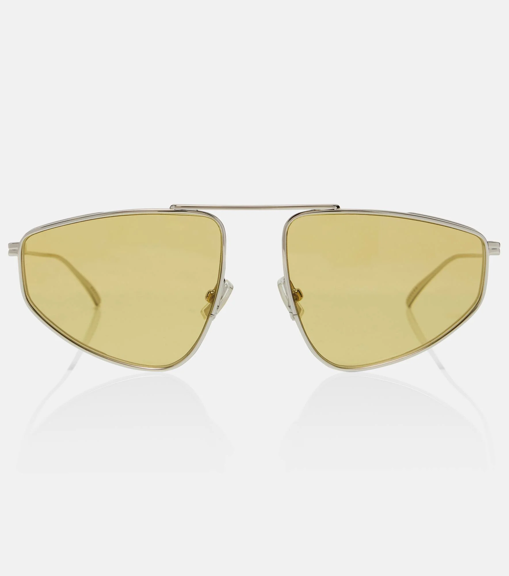 The Light Ribbon aviator sunglasses from Bottega Veneta showcase a streamlined aviator silhouette. The pair is crafted in Italy and features a sleek silver-tone metal frame paired with tinted yellow lenses. Product Details - Frame material: metal - Frame color: silver - Lens filter category 1 - Color: silver - Lens color: yellow - Made in Italy - Includes: case, cleaning cloth - The color of the case may vary - Item number: P01145573 Size & Fit - Lens width: 59mm-2.3" - Bridge size: 18mm-0.7" - Earpiece length: 140mm-5.5"
