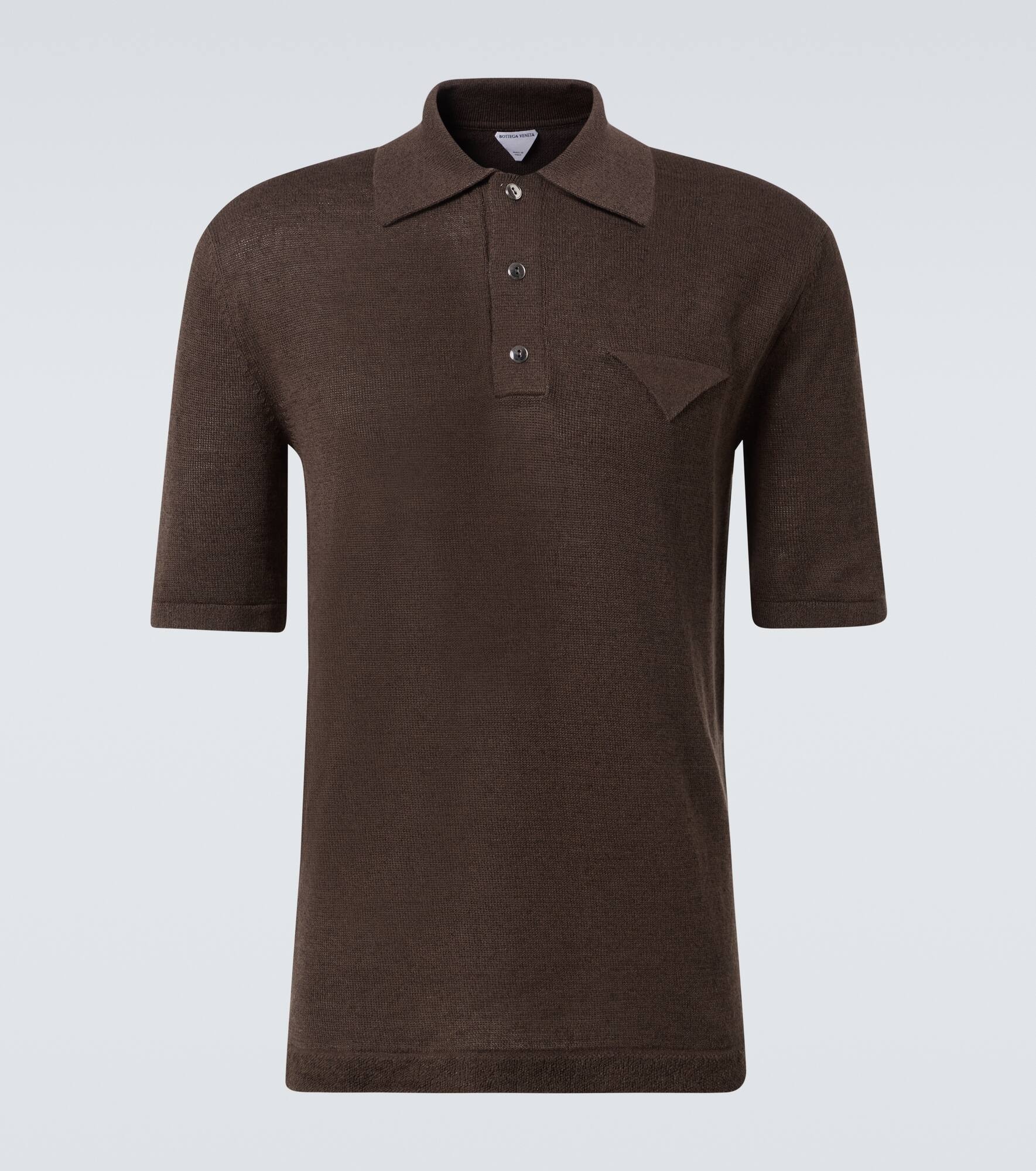 In place of overt logo detailing, Bottega Veneta favors subtle triangular motifs that reference geometry as well as the "V" in Veneta. This polo shirt is made from lightweight linen and feature the triangle motif at the chest pocket. Product Details - Material: 70% linen, 30% cotton - Care instructions: hand wash - Made in Italy - Designer color name: Dark Brown Melange - Item color: brown - Material II: 65% linen, 27% cotton, 7% polyamide, 1% elastane - Closure: button fastening - Item number: P01031719 Size & Fit - True to size - Straight fit - Stretchy fabric - Falls to the hip - The model in the picture is 185cm-6'1" and wearing a size L