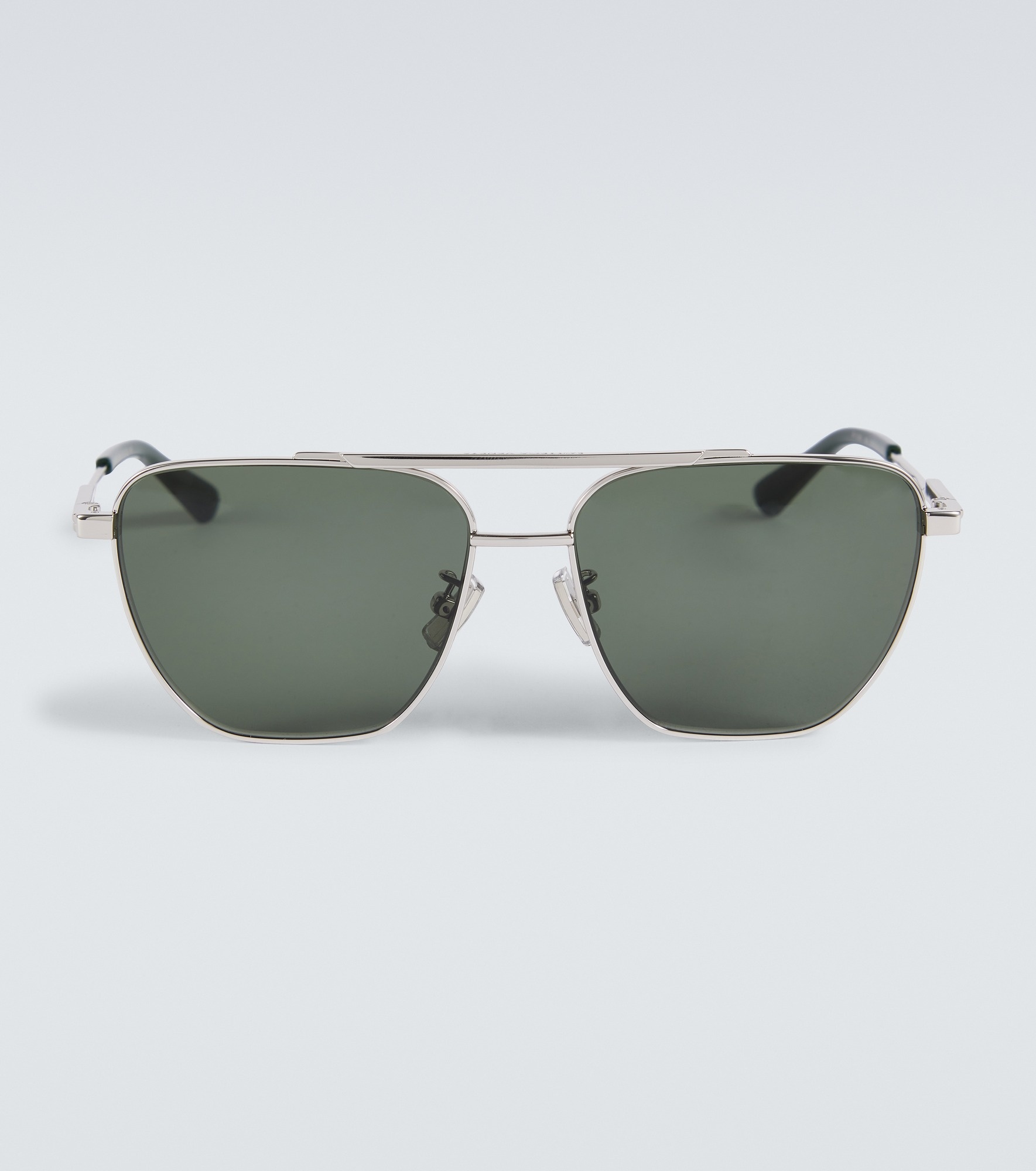 These silver-tone metal sunglasses from Bottega Veneta have a double nose bridge and tinted lenses in a geometric aviator-inspired shape. This style comes in a protective leather case, the color of which may vary. Product Details - Frame color: silver - Frame material: metal - Lens color: dark green - comes in a logo-embossed case - comes with cleaning cloth - The color of the case may vary - Lens filter category 3 - Made in Italy - Item number: P00805394 Size & Fit - Lens width: 57mm-2.25" - Bridge size: 15mm-0.6" - Earpiece length: 145mm-5.7"