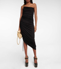 Suspended from a sculptural metal strap, this one-shoulder midi dress from Bottega Veneta is made from ruched jersey and reaches an asymmetric hem. Product Details - Made in Italy - Material: 100% viscose - Care instructions: dry clean - Designer color name: Black - Details: 100% metal - Item number: P00758311 Size & Fit - Fits large to size - we recommend trying one size smaller - Fitted - Weighted, due to heavy embellishments - The model seen in the picture is 178cm-5'10" and wearing a size IT 38