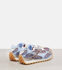 Bottega Veneta has inspired individuality and new modes of craftsmanship since 1966. The Orbit sneakers are a retro-inspired pair made from mesh and subtly boast the brand's logo on the sides. Product Details - Upper: fabric, polyurethane - Lining: fabric - Sole: fabric insole, rubber sole - Toe shape: round toe - Made in Italy - Includes: dust bag, shoe box - Designer color name: Blue Bell/Barolo - Item color: blue, brown, silver - Item number: P01099530 Size & Fit - True to size - Slightly wide - Half sizes please take the next size up - European sizes - 2cm-1" platform (size EU 38) - 3cm-1" wedge heel (size EU 38)