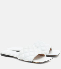 Bottega Veneta's padded sandals are defined by matelassé-quilted straps, offering a contemporary take on the Italian label's iconic intrecciato weave. Crafted in Italy from white lamb leather, this slip-on style is shaped with a square toe and slender heels. Showcase yours with cropped tailoring. Product Details - Lining: leather - Upper: lamb leather - Sole: leather insole, leather and rubber sole - Comes with a box - Toe shape: square open toe - Designer color name: Optic White - Made in Italy - Item number: P00481320 Size & Fit - True to size - European sizes - 1,5cm-0.5" heel (size EU 38)