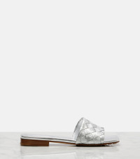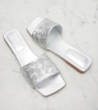 Crafted in Italy from leather, the Parco mules from Bottega Veneta showcase the Intrecciato technique on the uppers. Developed in the 1970s, this method guarantees the longevity of its leather goods. Product Details - Upper: leather - Lining: leather - Sole: leather insole, rubber sole - Color: silver - Toe shape: square open toe - Made in Italy - Includes: shoe box - Designer color name: Silver - Item number: P01125995