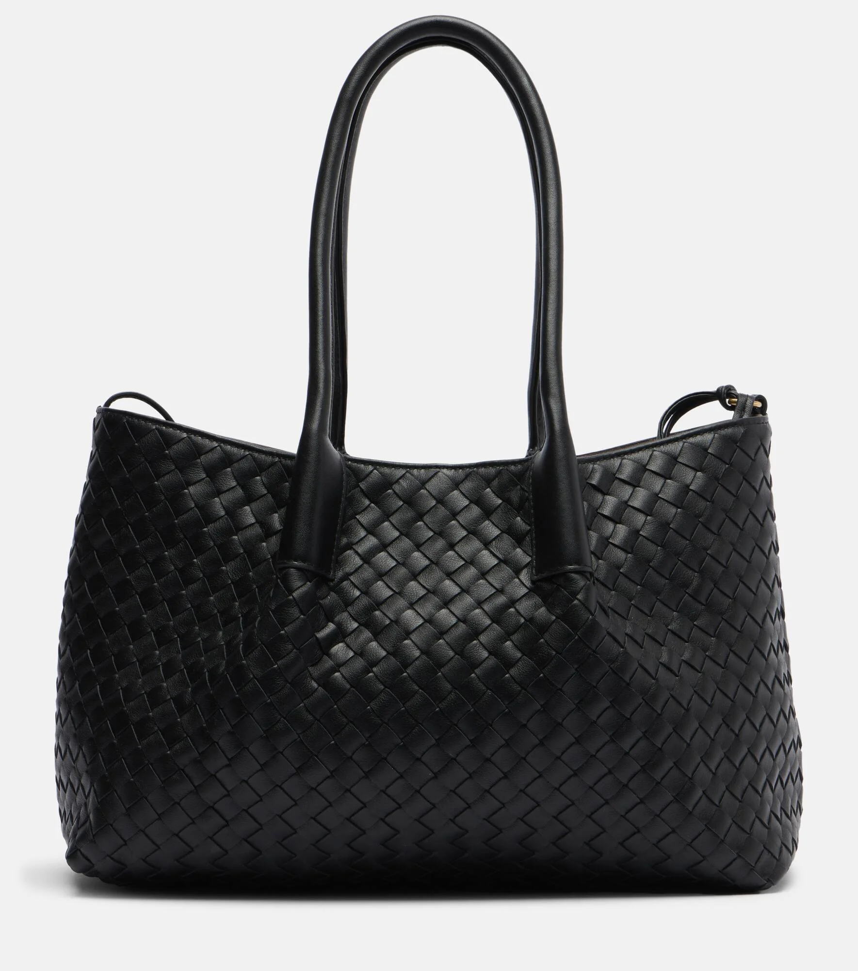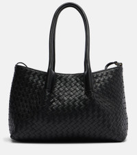 The Pinacoteca tote bag from Bottega Veneta is crafted using the Intreccio technique and showcases a reversible style with a suede lining. The Small design is complete with two long top handles and a detachable zipped pouch. Product Details - Material: calf leather (suede) - Lining: leather - Made in Italy - Designer color name: Black/Fondant-M Br - Item color: brown - Top handles - Internal details: single compartment - Closure: self-tie closure - Detachable zipped pouch - Item number: P01117801 Size & Fit - Height 21cm-8.5" - Width 33cm-13" - Depth 13cm-5" - Length of handles 46cm-18" - Clutch height 11cm-4.5" - Clutch width 20cm-8"