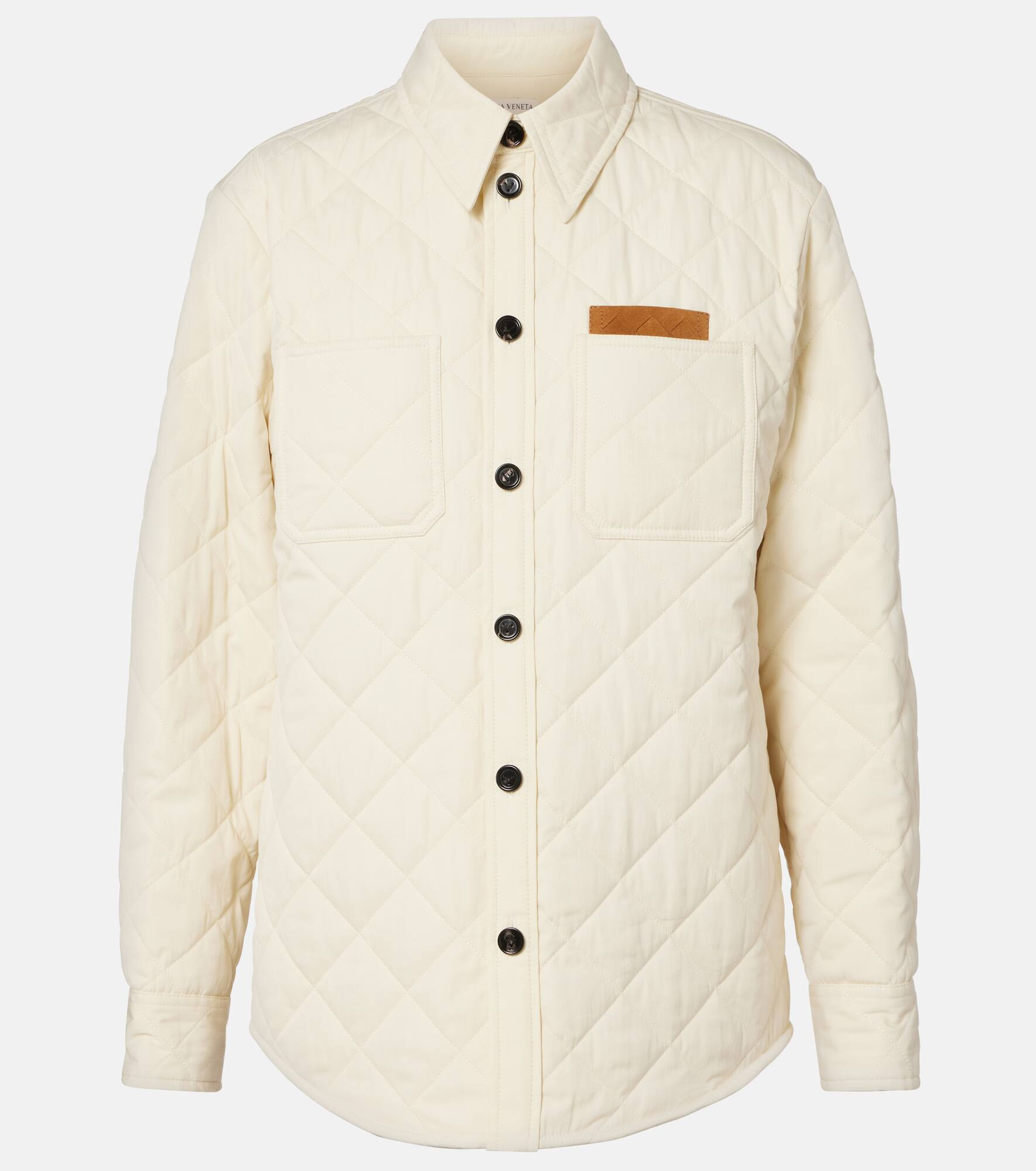 This Bottega Veneta quilted overshirt is crafted in Italy from a soft cotton blend. The piece is finished with patch pockets, a subtle Intrecciato suede patch, and buttoned cuffs. Product Details - Material: 79% cotton, 21% polyamide - Care instructions: do not wash - Made in Italy - Designer color name: Sea Salt - Item color: white - Lining: 79% cotton, 21% polyamide - Filling: 100% polyester - Contains non-textile parts of animal origin - Insert: 100% leather - Closure: buttoned front - Pockets: patch pockets - Cuff: two buttons - Item number: P01057268 Size & Fit - True to size - Straight fit - Non-stretchy fabric - Falls below the hip - The model seen in the picture is 178cm-5'10" and wearing a size IT 40