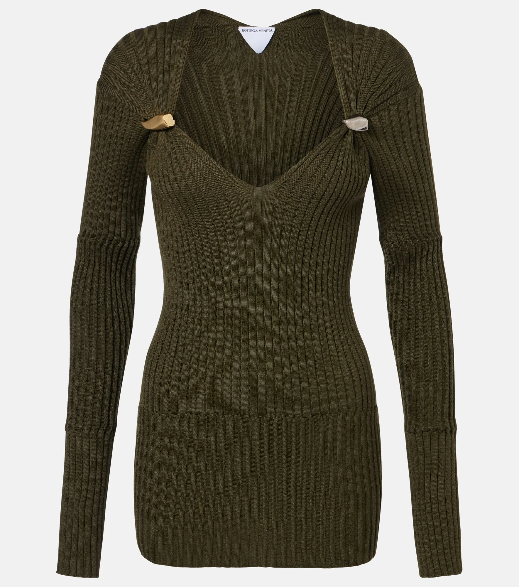Bottega Veneta's designs are coveted for their subtlety and seasonless aesthetic. This long-sleeve top is spun in Italy from cashmere and silk and features two gatherings at the chest, completed by a metal accent. Product Details - Material: 71% cashmere, 29% silk - Care instructions: dry clean - Made in Italy - Color: green - Designer color name: Wader Green - Item number: P01151704 Size & Fit - True to size - Fitted - Stretchy fabric - Falls below the hip - Height of model is 175cm-69" and wears a size XS