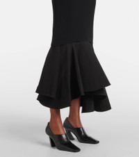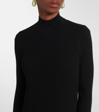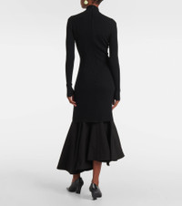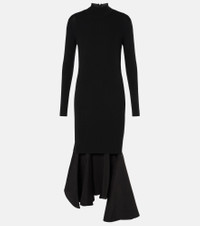 Asymmetric satin-trimmed ribbed-knit turtleneck midi dress Black