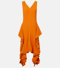 With cascading ruffles of fluid viscose, this dress from Bottega Veneta brings graceful movement to every step. The design showcases an asymmetric midi-length silhouette with elongated sides and a V-neckline, accentuating its sculpting effect. Product Details - Material: 97% viscose, 3% elastane - Care instructions: dry clean - Made in Italy - Designer color name: Apricot - Item color: orange - Details: 73% acetate, 27% silk - Closure: invisible zipper - Pockets: slit pocket - Item number: P01031272 Size & Fit - Fits large to size - we recommend trying one size smaller - Low back - Straight fit - Non-stretchy fabric - The model seen in the picture is 178cm-5'10" and wearing a size IT 38