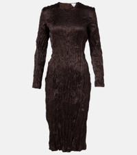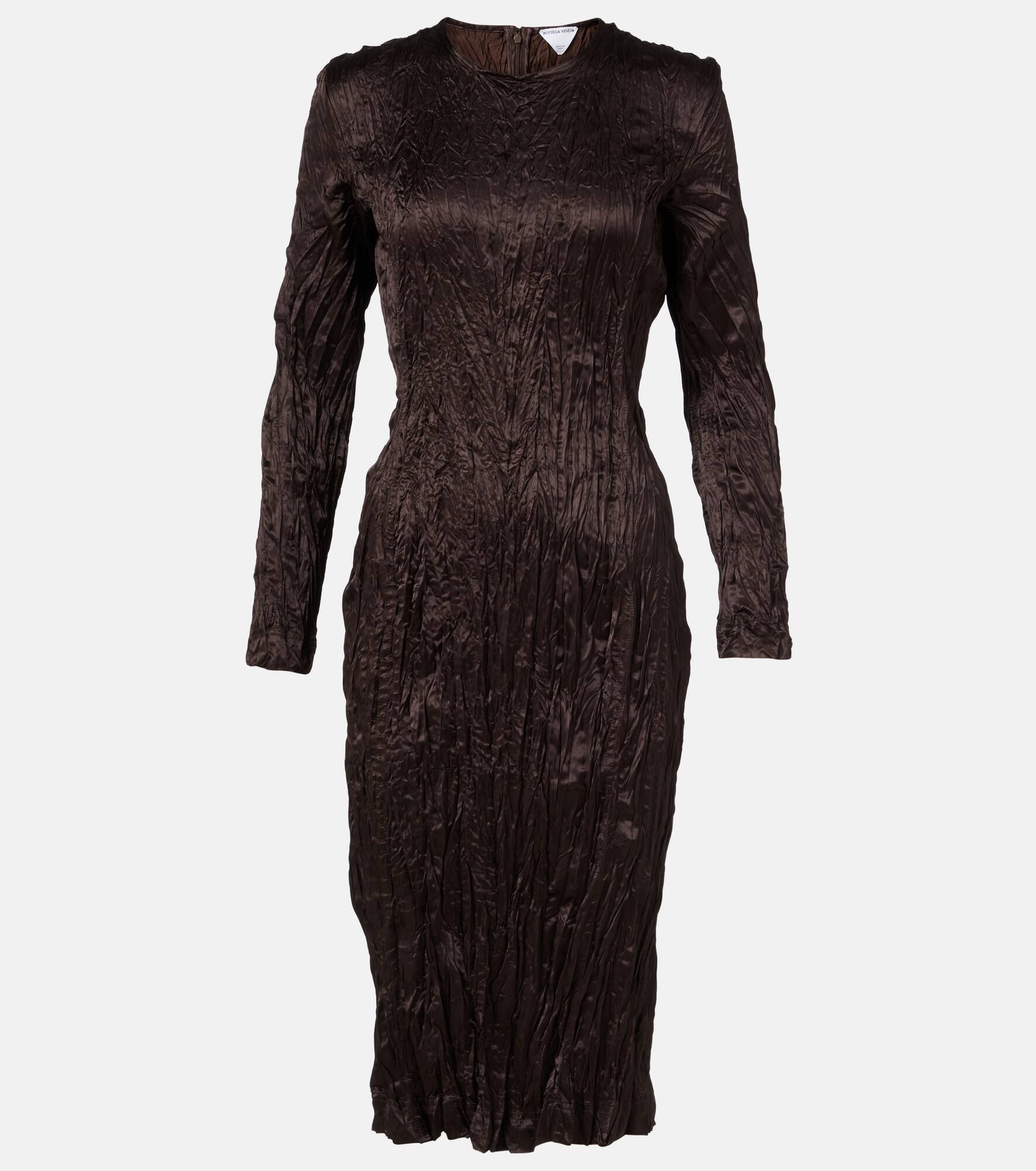 This satin midi dress from Bottega Veneta features the brand's Crushed Effect for added texture and depth. A rounded neckline and cinched waist enhance its sculpted silhouette, creating an effortlessly refined look. Product Details - Material: 62% viscose, 38% polyester - Care instructions: dry clean - Made in Italy - Designer color name: Ebony - Item color: brown - Closure: zip and hook fastening - Item number: P01031311 Size & Fit - True to size - Cinched waist - Non-stretchy fabric - The model seen in the picture is 178cm-5'10" and wearing a size IT 40