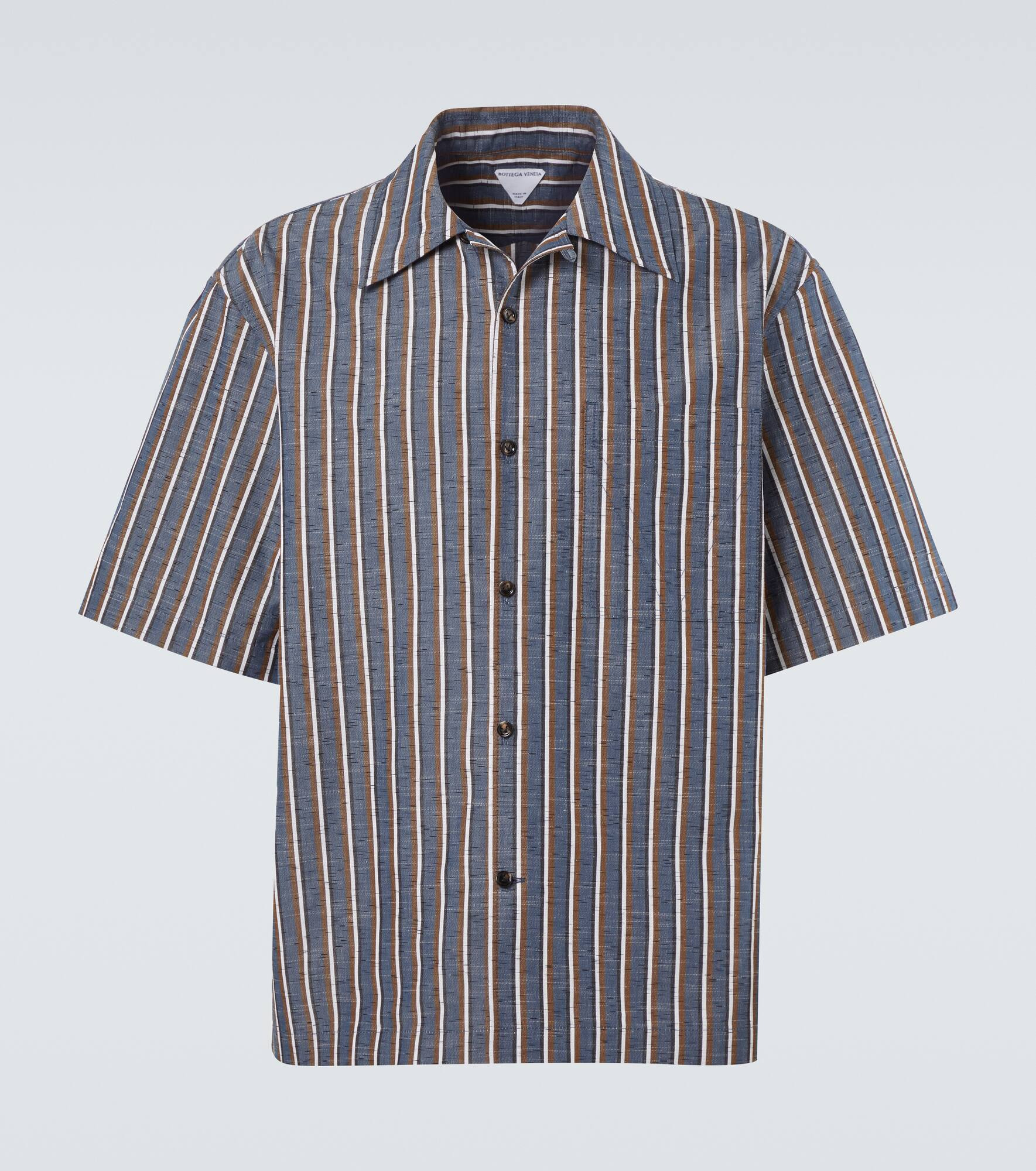 This Bottega Veneta shirt is made from a soft cotton and linen-blend and detailed with a refined striped pattern. Designed for a regular fit, the piece is an ideal choice for relaxed, everyday wear. Product Details - Material: 84% cotton, 12% linen, 4% polyamide - Care instructions: dry clean - Made in Italy - Designer color name: Blue/Khaki/Black - Item color: multicolor - Closure: buttoned front - Contains non-textile parts of animal origin - Pockets: patch pockets - Item number: P01059677 Size & Fit - True to size - Dropped shoulders - Without pleats in the back - Classic fit - Non-stretchy fabric - Falls to the hip - Height of model is 189cm-74.5" and wears a size IT 50