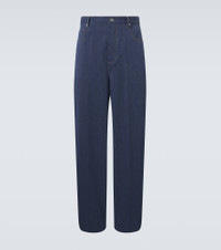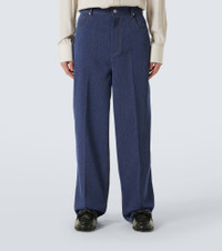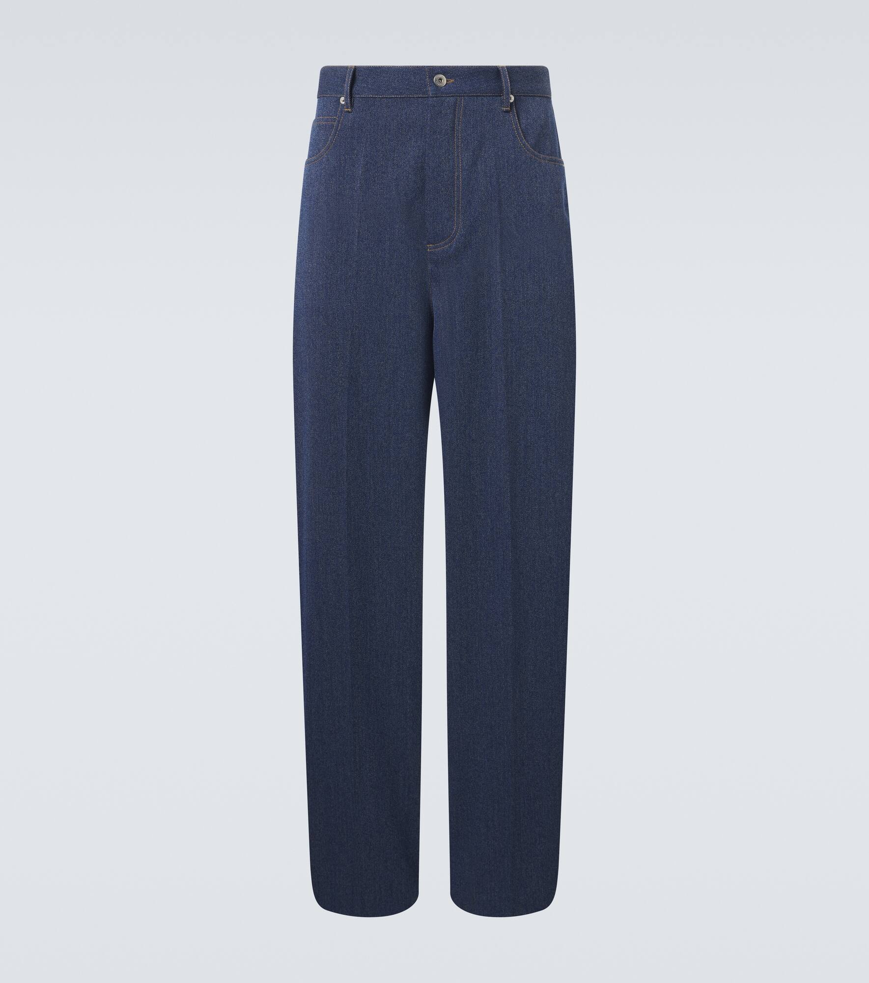 Crafted in Italy from wool and cotton, these pants from Bottega Veneta feature a wide-leg style. They simulate a denim effect and ensure all-day comfort. Product Details - Material: 63% wool, 37% cotton - Care instructions: dry clean - Made in Italy - Designer color name: Indigo - Item color: blue - Closure: button-down - Lining: 100% cotton - Pockets: side slit pockets, back pockets - Belt loops - Item number: P01031717 Size & Fit - True to size - Non-stretchy fabric - Wide-leg - High-waisted - The model in the picture is 185cm-6'1" and wearing a size IT 50