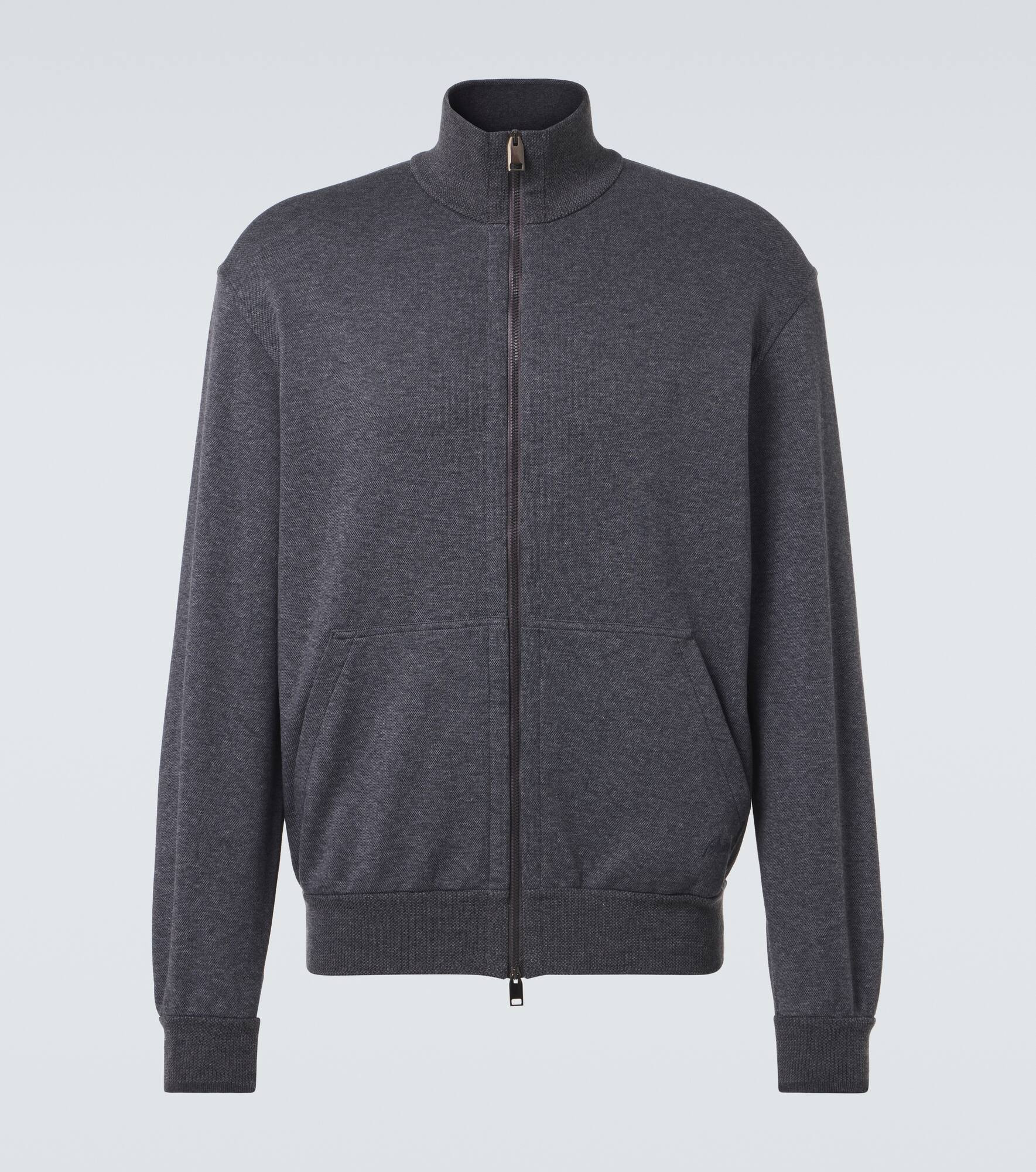Product Details - Material: 93% cotton, 7% polyamide - Care instructions: machine wash at 30 degrees - Made in Italy - Designer color name: Lead/Anthracite - Item color: gray - Length: regular (hip-length) - Sleeves: long-sleeved, set-in - Closure: two-way zipped front - Pockets: slant pockets - Cuff: ribbed - Collar: mockneck - Item number: P01048028 Size & Fit - True to size - Straight fit - Slightly stretchy fabric - Falls to the hip - The model in the picture is 185cm-6'1" and wearing a size L