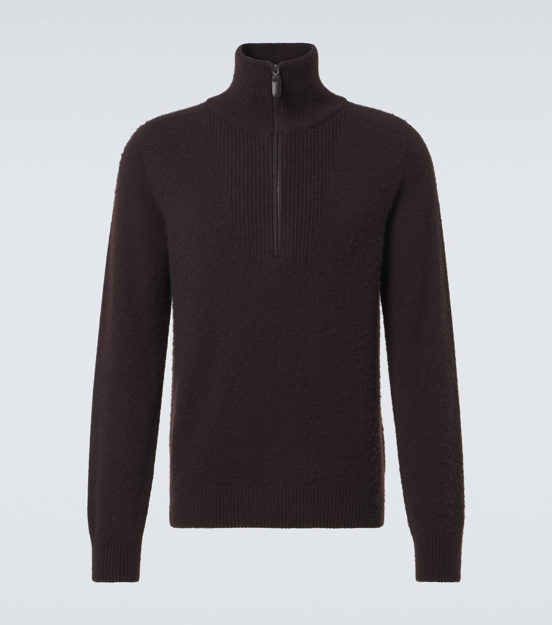 Product Details - Material: 50% silk, 50% wool - Care instructions: dry clean - Made in Italy - Designer color name: Coffee - Item color: brown - Closure: partially zipped front - Cuff: ribbed - Hem: ribbed, straight - Collar: mockneck - Contains non-textile parts of animal origin - Item number: P01048019 Size & Fit - True to size - Straight fit - Stretchy fabric - Falls to the hip - The model in the picture is 185cm-6'1" and wearing a size IT 50