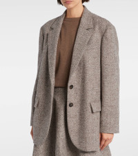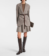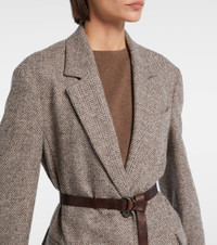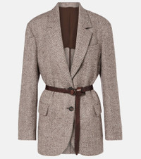 This Brunello Cucinelli blazer is a sophisticated choice for a structured, warm look. Crafted from a wool blend, the design features an attached leather belt and is finished with a herringbone pattern for an evergreen style. Product Details - Material: 73% wool, 27% polyamide - Care instructions: dry clean - Made in Italy - Designer color name: Marrone/Grigio/Beige - Item color: gray, brown - Lining: 74% acetate, 26% silk - Sleeve lining: 65% acetate, 35% polyester - Notched lapel - Cuff: four buttons - Pockets: flap pockets - Closure: single-breasted (two buttons) - Attached belt - Contains non-textile parts of animal origin - Includes: dust bag - Item number: P01083413 Size & Fit - True to size - Dropped shoulders - Loose fit, comes with belt - Non-stretchy fabric - Falls below the hip - The model seen in the picture is 178cm-5'10" and wearing a size IT 40