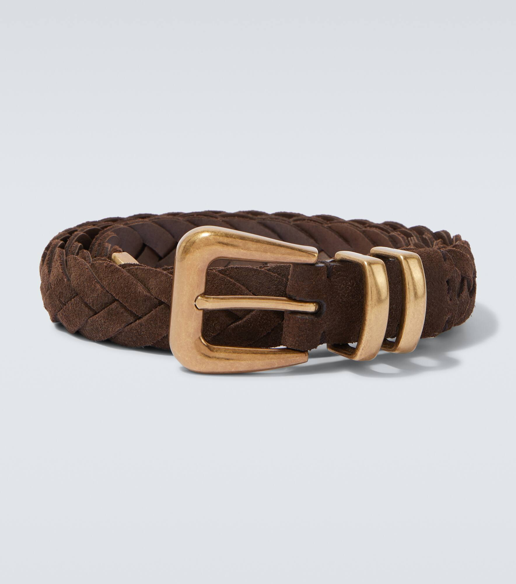 Brunello Cucinelli's designs are created in Solomeo, a medieval hamlet whose art and traditions are woven into the house's every fiber. This suede belt features an intricate braided finish and a square buckle with an antique gold tone. Product Details - Material: leather (suede) - Lining: leather - Made in Italy - Designer color name: C7284 - Item color: brown - Hardware color: antique gold - Closure: buckle fastening - Includes: dust bag, box - Item number: P01056107 Size & Fit - Width 2,5cm-1" - Buckle width 4cm-1.5"