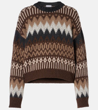 Brunello Cucinelli's designs are created in Solomeo, a medieval hamlet whose art and traditions are woven into the house's every fiber. A versatile building block, this jacquard sweater is knitted from cashmere into a charming all-over geometric pattern. Product Details - Material: 100% cashmere - Care instructions: hand wash - Made in Italy - Designer color name: Caffe' - Item color: brown - Details: 100% polyester - Material II: 55% polyamide, 45% polyester - Material III: 50% mohair, 36% polyamide, 14% wool - Material IV: 100% polyamide - Hem: ribbed - Item number: P01091752 Size & Fit - True to size - Dropped shoulders - Designed for a loose fit - Non-stretchy fabric - Falls to the hip - Height of model is 179cm-70.5" and wears a size XS