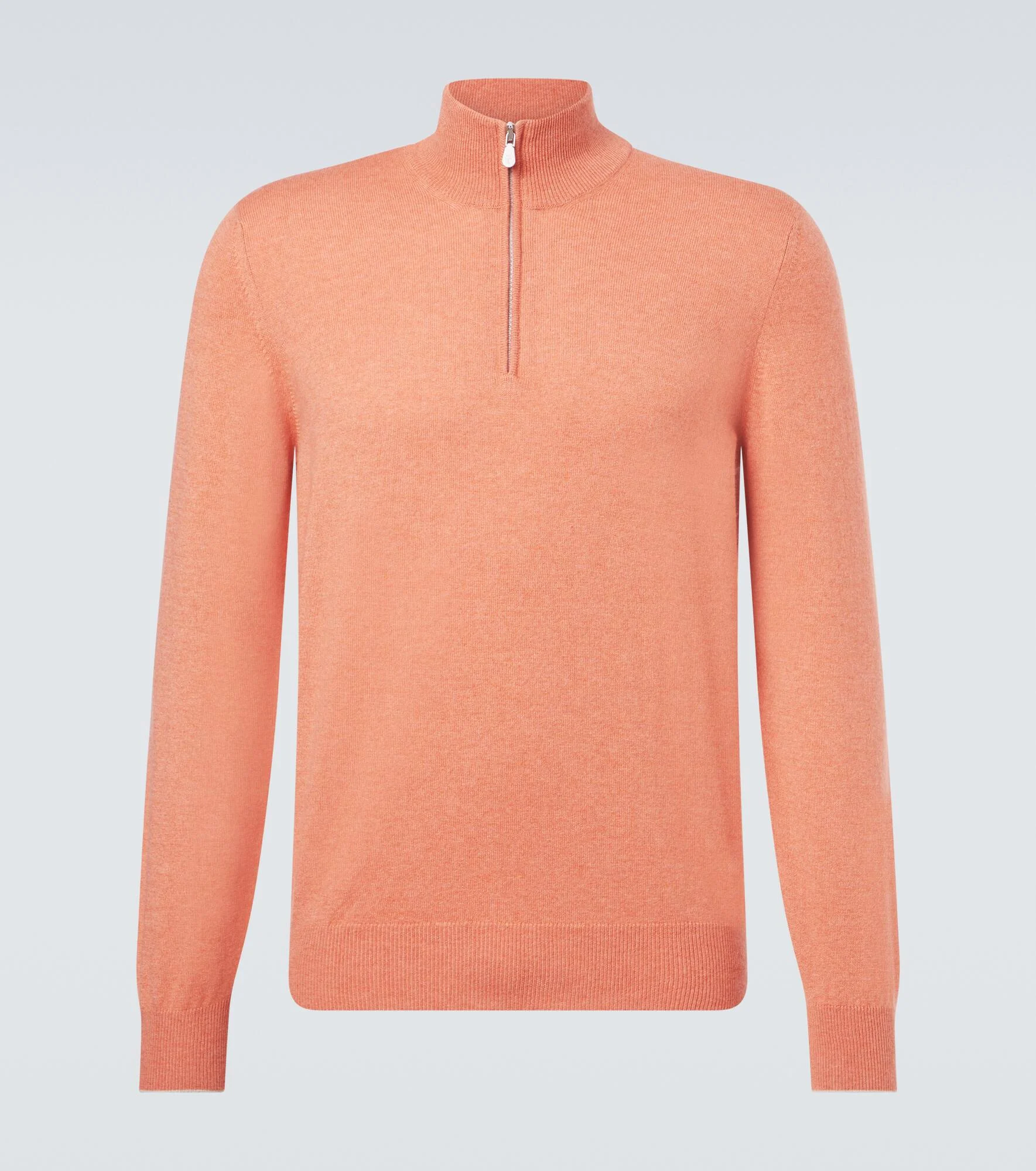 Supreme softness characterizes Brunello Cucinelli's cashmere pieces, which are produced in Italy from the finest fibers. This cashmere sweater is designed with a soft pastel hue and features ribbed trims and a partially zipped front. Product Details - Material: 100% cashmere - Care instructions: hand wash - Made in Italy - Designer color name: Pesca - Item color: pink - Closure: partially zipped front - Cuff: ribbed - Hem: ribbed - Item number: P01138401 Size & Fit - True to size - Designed for a loose fit - Non-stretchy fabric - Falls to the hip - The model in the picture is 185cm-6'1" and wearing a size IT 50