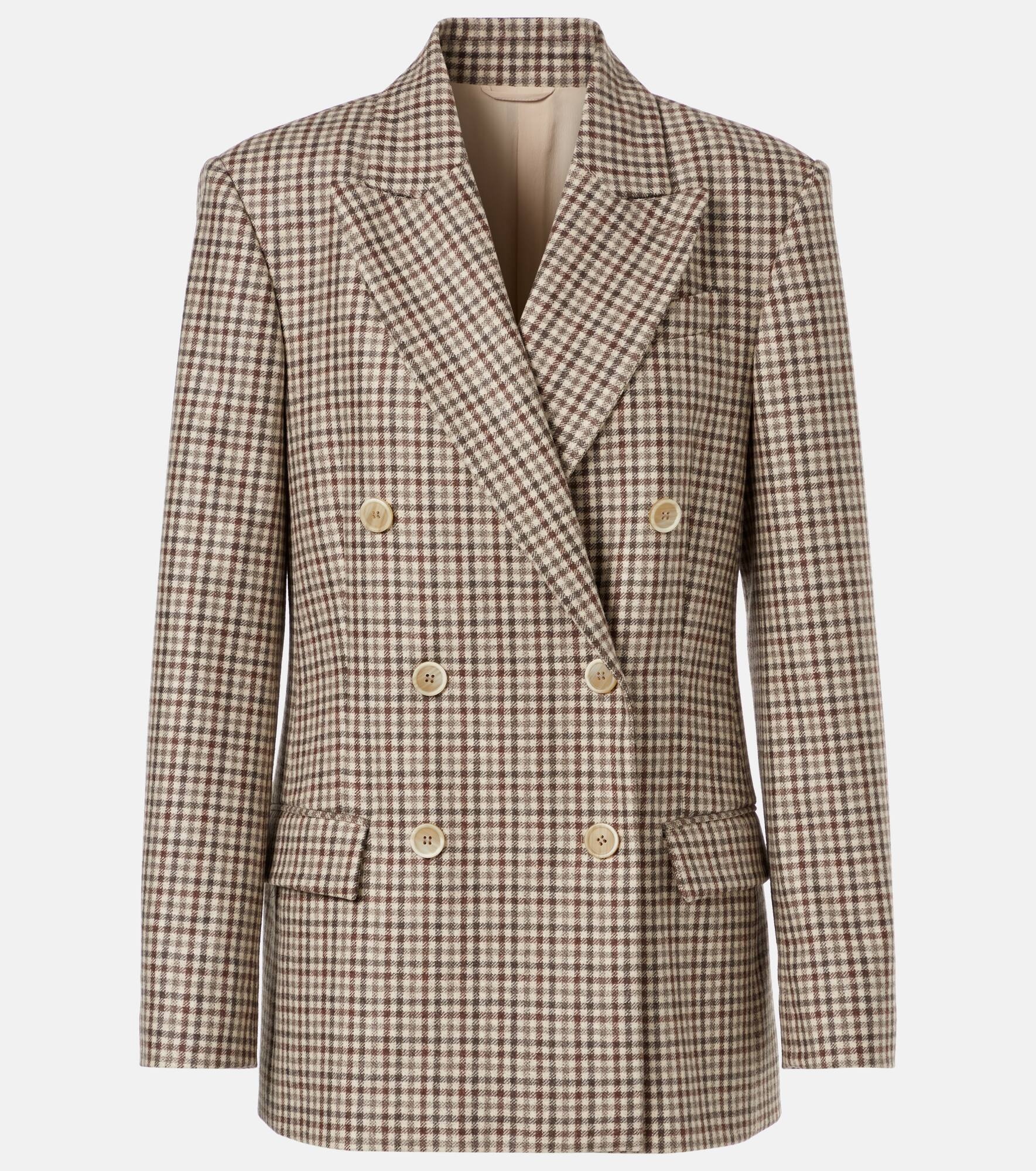 Brunello Cucinelli is renowned for its craftsmanship, and this double-breasted blazer is a perfect example of why. Made in Italy from checked virgin wool, it has structured shoulders and a streamlined silhouette. Product Details - Material: 100% virgin wool - Care instructions: dry clean - Made in Italy - Designer color name: Beige/Marrone/Brown - Lining: 74% acetate, 26% silk - Fully lined - Shoulder construction: structured - Length: regular (hip-length) - Notched lapel - Closure: double-breasted (six buttons) - Vent: single - Pockets: flap pockets - Item number: P01041533 Size & Fit - slit length 23cm-9"