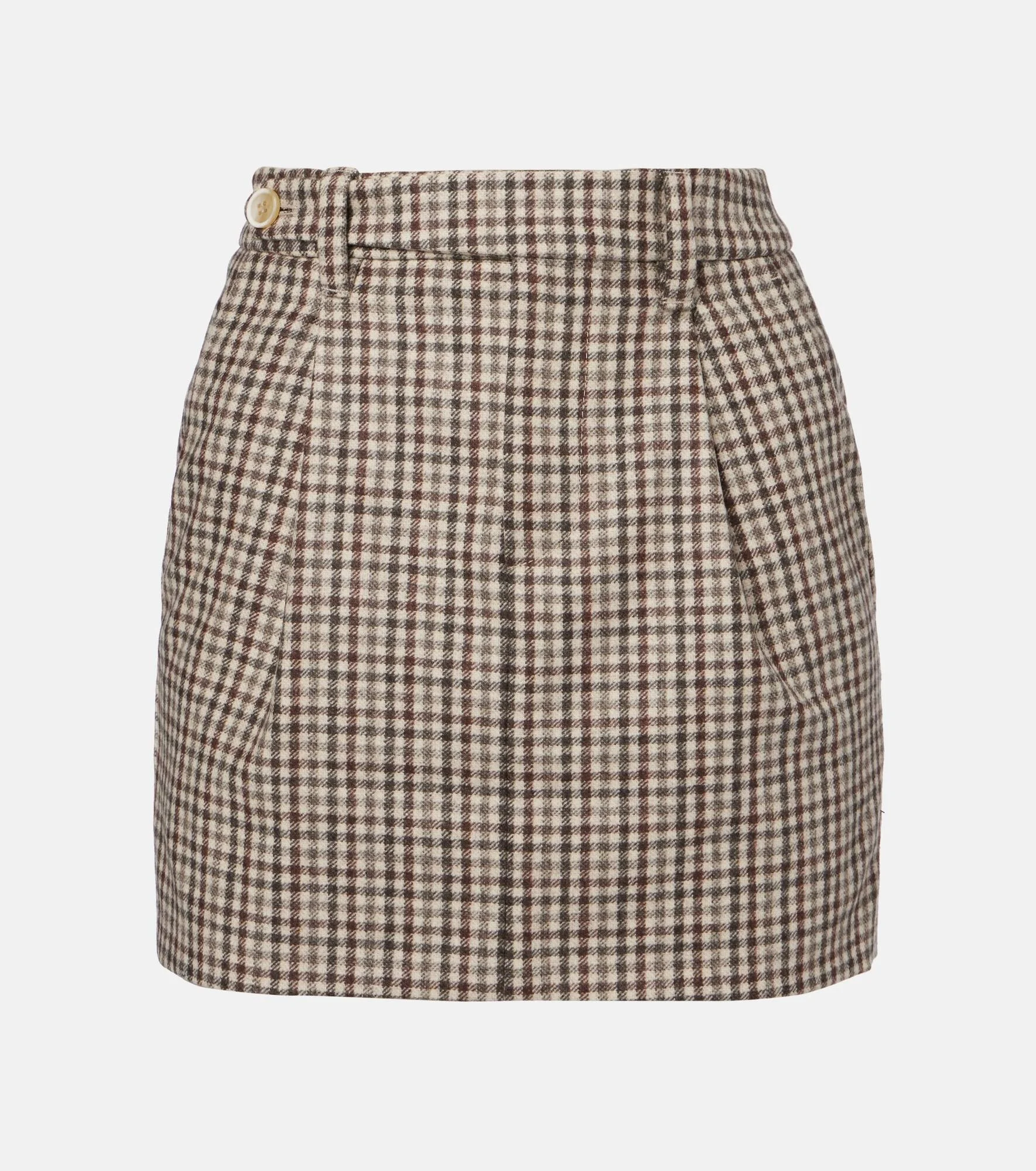 Brunello Cucinelli's designs are created in Solomeo, a medieval hamlet whose art and traditions are woven into the house's every fiber. Crafted from virgin wool flannel, this checked miniskirt features a front zipped closure and a side button fastening. Product Details - Material: 100% virgin wool - Care instructions: dry clean - Made in Italy - Designer color name: Beige Maroon - Item color: beige, brown - Lining: 65% acetate, 35% polyester - Lining II: 100% cotton - Closure: zip and button fastening - Pockets: slant pockets, back pockets - Belt loops - Fully lined - Item number: P01054242 Size & Fit - True to size - Non-stretchy fabric - Sits low on the hips - The model seen in the picture is 178cm-5'10" and wearing a size IT 40