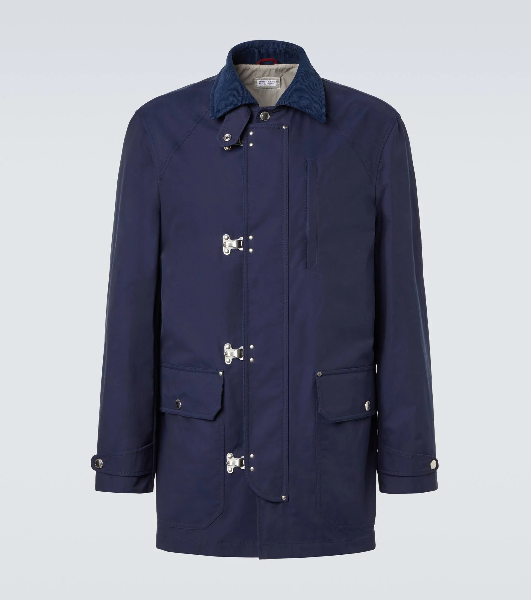 Brunello Cucinelli's designs are created in Solomeo, a medieval hamlet whose art and traditions are woven into the house's every fiber. Made from a cotton blend, this jacket features a velvet collar and practical front pockets. Product Details - Material: 67% cotton, 33% polyamide - Care instructions: dry clean - Made in Italy - Color: blue - Designer color name: Blue Colorato+Geyser - Item color: blue - Material II: 100% cotton - Lining: 100% polyamide - Contains non-textile parts of animal origin - Hardware color: silver - Collar: classic (Straight point) - Pockets: flap pockets - Closure: toggle fastenings - Includes: dust bag - Item number: P01138357 Size & Fit - True to size - Designed for a loose fit - Non-stretchy fabric - Falls below the hip - Height of model is 189cm-74.5" and wears a size 50